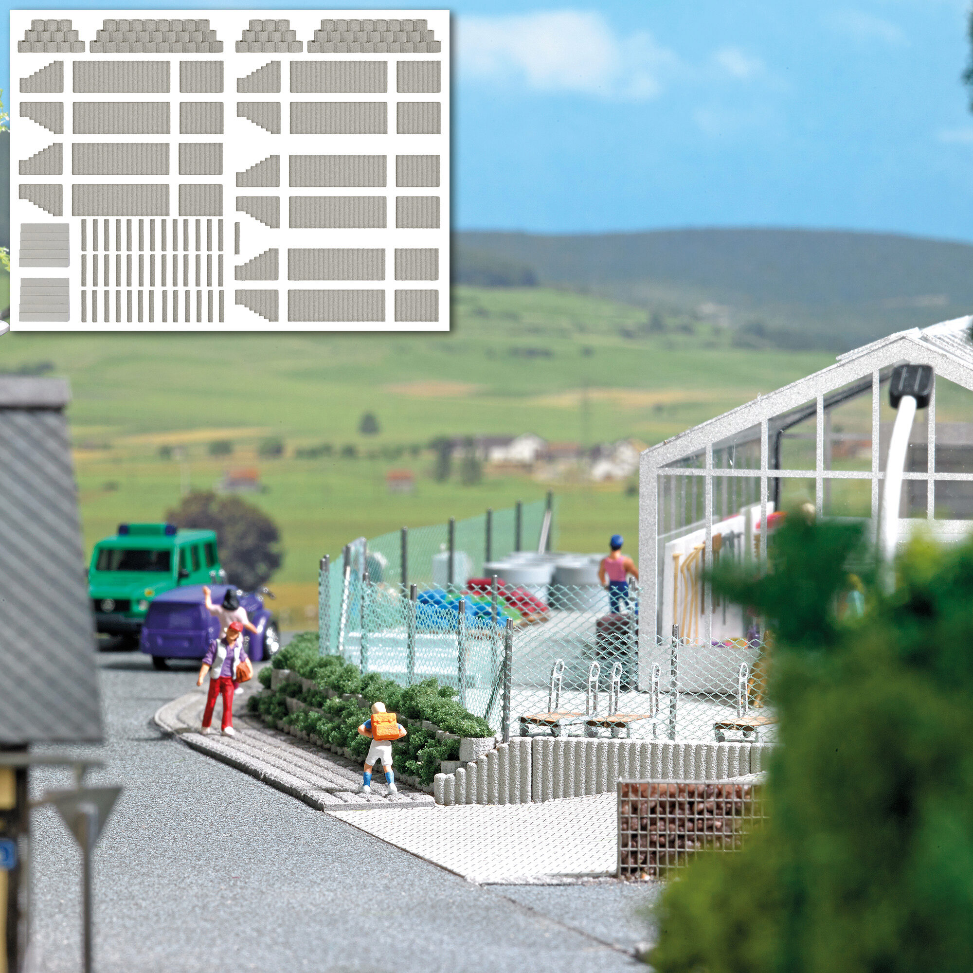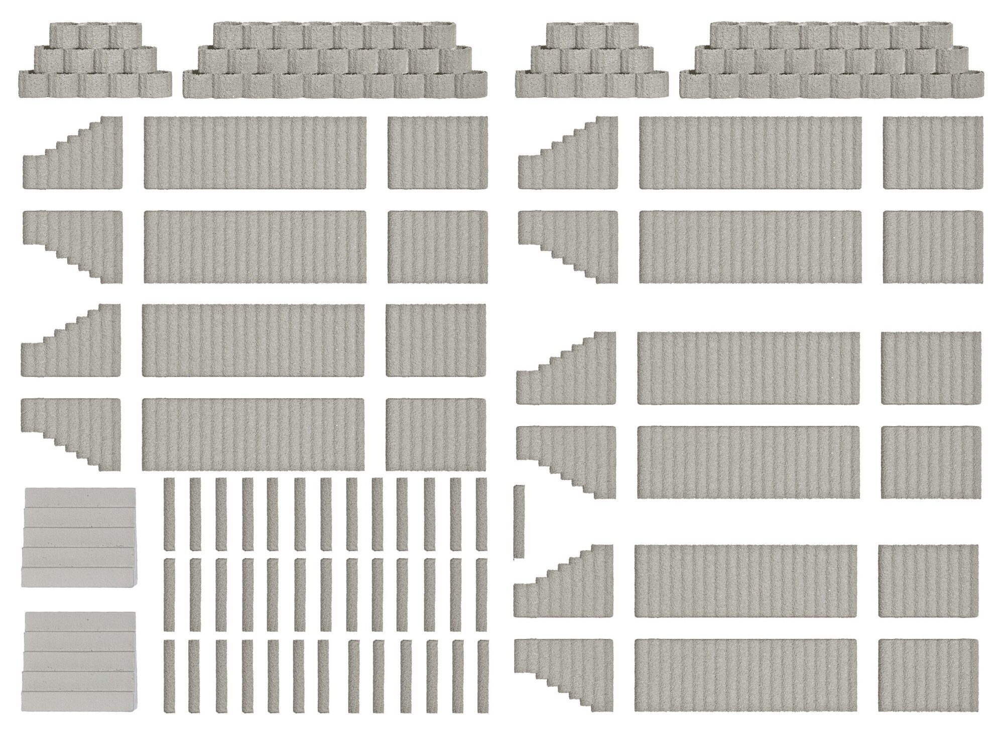 Reichhaltiges Set zur Befestigung und Bepflanzung des Erdreiches im Garten- und Landschaftsbau. Mit Steinpalisaden in gerader und aufsteigender Form, Betonpflanzringen und Steintreppen in verschiedenen Größen. Gesamtlänge: über 700 mm.