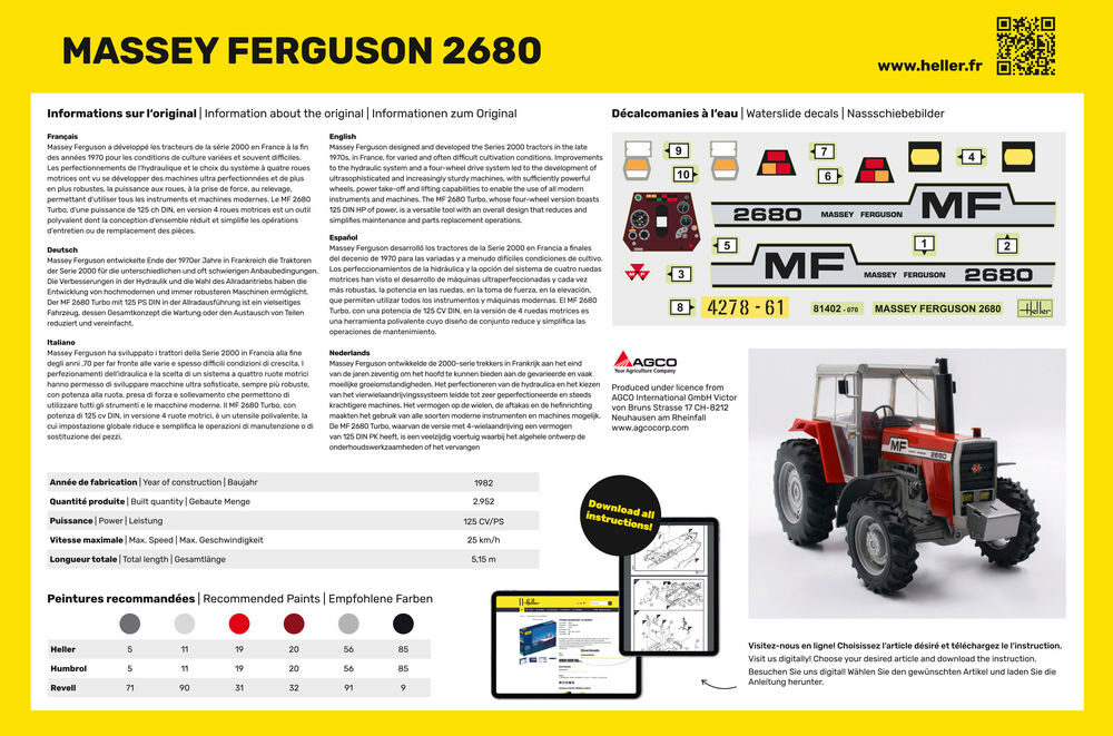 Ein klassischer Traktor aus den 80er Jahren zum Zusammenbauen und Bemalen, mit der Möglichkeit bewegliche Teile wie Vorderachse, Räder und Fahrertür darzustellen. Jahre der Herstellung des Original Traktors: 1980 - 1985 Der wachsende Trend zu Wintergetreide hat den Herbst zu einer Spitzenzeit gemacht. Sämlinge sollten schneller vorbereitet werden. Betriebsbedingungen sind schwierig. Daher die Notwendigkeit für immer leistungsfähigere Traktoren, immer zuverlässiger, vereinfachte den täglichen Gebrauch und mit wesentlichen Komfort für lange Arbeitstage ausgestattet. Um diesem Bedürfnis gerecht zu werden, hat Massey Ferguson in den späten siebziger Jahren, in Frankreich, in den mannigfaltigen und oft schwierigen Anbaubedingungen die Traktoren der 2000er Serie entwickelt und entwickelt. Die Verbesserungen in der Hydraulik und die Wahl des Allradantriebssystems haben die Entwicklung fortgeschrittener und zunehmend robusterer Maschinen, Antriebsräder, Zapfwelle, Anheben, ermöglicht, alle zu verwenden moderne Instrumente und Maschinen. Der MF 2680 Turbo mit 125 PS DIN 4WD ist ein vielseitiges Werkzeug, dessen Gesamtkonstruktion die Wartung oder den Austausch von Teilen reduziert und vereinfacht. Schließlich ist das in der Höhe und Neigung verstellbare in der Kabine integrierte Lenkrad mit Heizung und Klimaanlage ausgestattet. A classic 80s tractor to assemble and paint, with the ability to display moving parts such as front axle, wheels and driver's door. The growing trend towards winter cereals has made autumn a peak period. Seedings should be prepared more quickly. Operating conditions are difficult. Hence the need for more and more powerful tractors, more and more reliable, simplified everyday use, and equipped with essential comfort for long working days. It is to meet this need that Massey Ferguson designed and developed in the late seventies, in France, in the varied and often difficult farming conditions, the tractors of the 2000 series. The improvements in hydraulics and the choice of the four-wheel-drive system have seen the development of advanced and increasingly robust machines, power wheels, PTO, lifting, allowing to use all modern instruments and machines. The MF 2680 Turbo with 125 hp DIN 4WD is a versatile tool whose overall design reduces and simplifies parts maintenance or replacement. Finally, the cabin integrated steering wheel adjustable in height and inclination is equipped with heating and air conditioning.