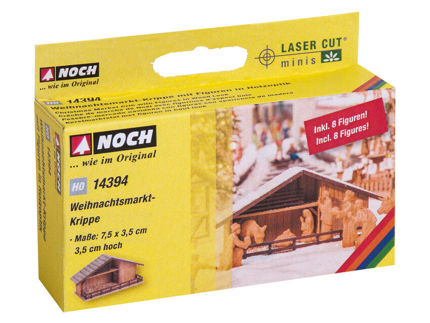 Die Weihnachtsmarkt-Krippe von NOCH orientiert sich dabei eher an kleinen Weihnachtsmärkten, wie man sie etwa in Wangen im Allgäu findet. Die kleine Krippe ist aus hochwertigen Materialien wie Laser-Karton und zu Teilen auch aus echtem Holz gelastert. Das exakt gearbeitete Modell lässt sich mit der enthaltenen Anleitung sehr leicht zusammenbauen. Hierfür wird ein spezieller Laser-Cut Kleber (Art.-Nr. 61104) von NOCH benötigt.