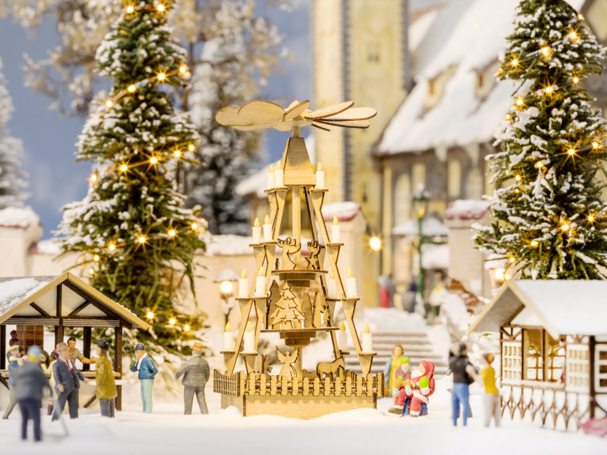 Die Weihnachtsmarkt-Pyramide von NOCH orientiert sich dabei eher an kleinen Weihnachtsmärkten, wie man sie etwa in Wangen im Allgäu findet. Die kleine Pyramide ist aus hochwertigen Materialien wie Laser-Karton und zu Teilen auch aus echtem Holz gelastert. Das exakt gearbeitete Modell lässt sich mit der enthaltenen Anleitung sehr leicht zusammenbauen. Hierfür wird ein spezieller Laser-Cut Kleber (Art.-Nr. 61104) von NOCH benötigt.