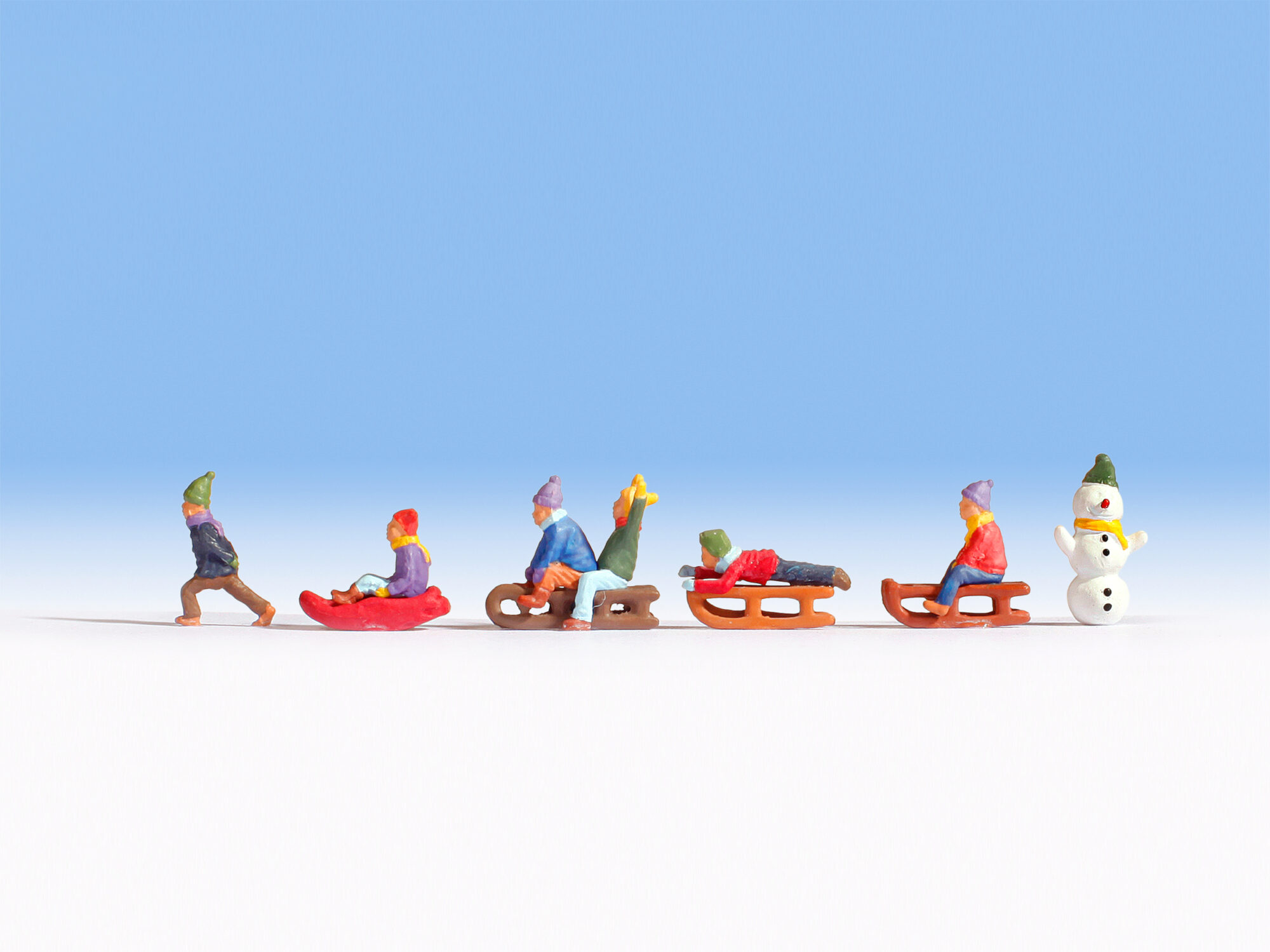 Das Set für die Spur TT (Maßstab 1:120, ca. 1,5 cm hoch) enthält sechs Kinder, vier Schlitten und einen Schneemann.