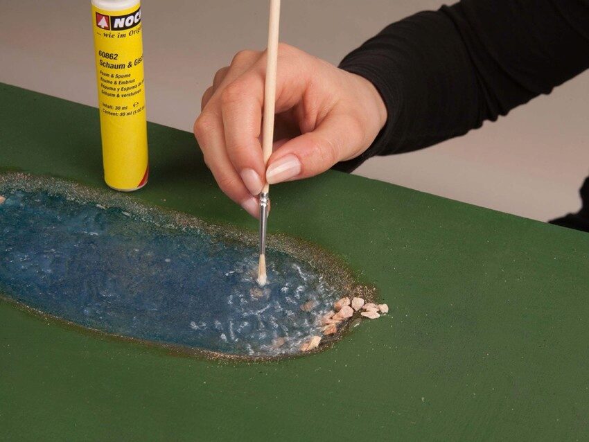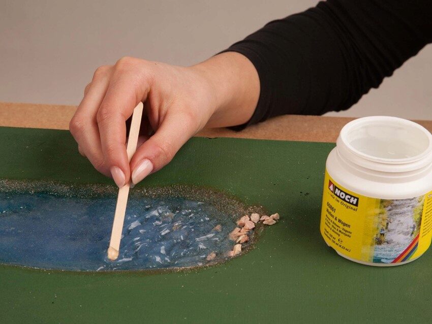 "Wellen & Wogen" ist eine pastöse Masse, die mithilfe eines kleinen Spachtels oder Zahnstochers auf die Gewässeroberfläche aufgebracht wird. Um höhere Wellen zu modellieren, die sich z. B. im Uferbereich brechen, wird die Masse zuerst mit einem Borsten-Pinsel in Richtung Ufer "geschoben". Um die Wellen aufrichten zu können, muss das Material zunächst etwas antrocknen und eine stabilisierende Haut bilden. Richten Sie die Masse anschließend wie einen "Hahnenkamm" auf. Es kann sein, dass Sie diesen Vorgang wiederholen müssen, bis die Welle sicher steht und aushärten kann. Das Material wird nach ca. 12 - 18 Stunden hart und trocknet transparent aus.