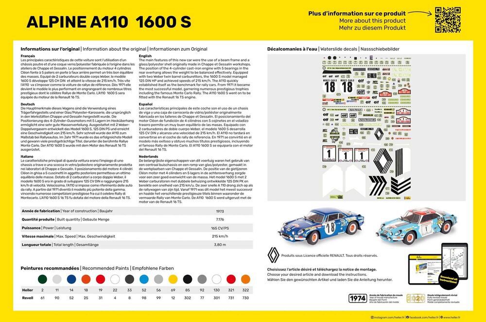 Heller entdeckt die berühmtesten Modelle seines Erbes neu. Nach dem R8 Gordini ist Heller dabei, eines seiner besten Modelle wieder aufzulegen: Die Alpine A110 (1600), Maßstab 1/24. -Original Tool -Neue Decals Dieses Modell wurde 1974 von der Firma Heller entwickelt. Dieses Modell mit 139 Teilen wurde seit 1986 nicht mehr von Heller hergestellt. Die Alpine A 110 Saga debütierte 1962 in Dieppe. Der Erfinder der Marke, Jean Rédélé, wird dieses neue Modell auf der Basis des Modells A108 entwickeln, das auf Basis des Renault Dauphine entwickelt wurde. Der A 110 wird eine Menge Ersatzteile vom neuen Renault 8 bekommen. Die Hauptmerkmale dieses Wagens sind die Verwendung eines Trägerrahmens und einer Glas / Polyester-Karosserie, die ursprünglich in den Werkstätten von Chappe und Gessalin hergestellt wurden. Die Positionierung des 4-Zylinder-Cléon-Gussmotors mit 5 Lagern in einem hinteren Überhang ermöglicht eine sehr gute Balance. Ausgestattet mit 2 Weber Doppelvergasern entwickelt das 1600 S Modell 125 CH DIN und erreicht die Geschwindigkeit von 205 km / h. Sehr schnell wird sich der A110 als Referenz-Rallye-Auto etablieren. Ab 1971 wurde sie das erfolgreichste Modell und gewann viele prestigeträchtige Titel, darunter die berühmte Rallye Monte Carlo Der A110 1600 S wird mit dem Renault 16 TS Motor ausgestattet sein. 1973 kaufte Renault Alpine und beschloss, an der brandneuen Rallye-Weltmeisterschaft teilzunehmen. Die 4 Musketiere von Alpine Renault (Jean-Claude Andruet, Jean-Pierre Nicolas, Jean-Luc Thérier, Bernard Darniche) wurden unter den 13 in der Weltmeisterschaft registrierten Rennen, 6 Rennen gewinnen und Alpine Renault zum ersten Hersteller-Champion der Welt der Rallyes machen. Von 1963 bis Juli 1977 werden in Dieppe 7176 Exemplare der verschiedenen A110-Modelle hergestellt. In anderen Ländern wie Spanien, Brasilien, Mexiko, Bulgarien, werden die Alpine-Modelle in Lizenz hergestellt. Bis heute ist die Alpine A110 "Berlinette" das mythischste Modell französischer Sportwagen der letzten 50 Jahre. Renault belebt 2018 die fabelhafte Alpine mit seinem brandneuen Modell, das schon jetzt alle Liebhaber der Marke fasziniert. Heller rediscovers the most iconic cars models of its heritage. After the R8 Gordini, Heller is about to reissue one of its finest model kit with : The Alpine A110 (1600), scale 1/24. -Original Tool -New decals This model was developed by Heller Company in 1974. Rich of 139 pieces, this model had not been produced by Heller since 1986. The Alpine A 110 saga debuted in Dieppe in 1962. The creator of the brand, Jean Rédélé will develop this new model on the basis of the A108 model, which was designed from the Renault Dauphine. The A 110 will borrow a lot of spare parts from the new Renault 8. The main characteristics of this car are the use of a beam frame and a glass / polyester shell originally manufactured in the Chappe and Gessalin workshops. The positioning of the 4-cylinder Cléon cast iron engine with 5 bearings in a rear overhang allows a very good balance of the masses. Equipped with 2 Weber double body carburettors, the 1600 S model develops 125 CH DIN and reaches the speed of 205 KM / H. Very quickly the A110 will establish itself as the reference rally car. From 1971 she became the most successful model by winning many prestigious titles including the famous Monte Carlo Rally The A110 1600 S will be equipped with the Renault 16 TS engine. In 1973 Renault bought Alpine and decided to participate in the brand new World Rally Championship. The 4 musketeers of Alpine Renault (Jean-Claude Andruet, Jean-Pierre Nicolas, Jean-Luc Thérier, Bernard Darniche) will win 6 races among the 13 registered in the world championship, making Alpine Renault the first manufacturer champion of the world of rallies. 7176 copies of the various A110 models will be produced in Dieppe between 1963 and July 1977. Other countries, Spain, Brazil, Mexico, Bulgaria, will produce the Alpine models under license. To date the Alpine A110 called Berlinette remains the most mythical model of French sports cars of the past 50 years. Renault is reviving in 2018 the fabulous Alpine epic with its brand new model that already fascinates all lovers of the brand.