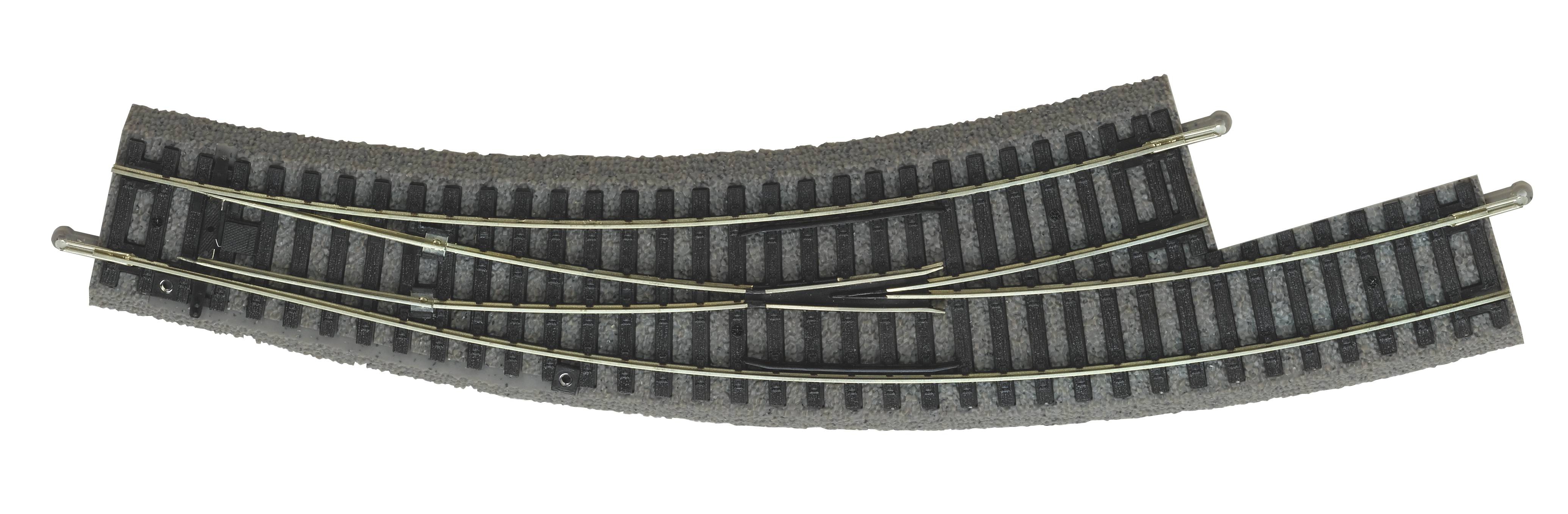 PIKO A-Gleis mit Bettung, feindetaillierten Schwellen und realistischer, scharfkantiger Schotternachbildung und Farbgestaltung. Bogenweiche BWL, links. Befahrbar von R2 nach R3, Radius des Stamm- bzw. Abzweiggleises R2. Handbetrieb mit Positionierung