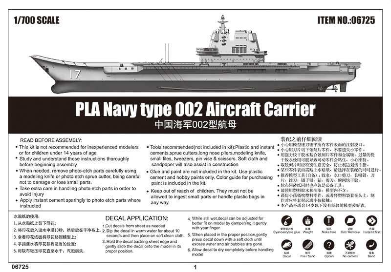 | More Features | - hull made from multi-directional slide moulds. - Detailed flight deck -Extensive photo-etched details included -Aircraft Wing includes: J-15 20pcs Z-8 2pcs -Complete ship and aircraft decal sets -stand included |