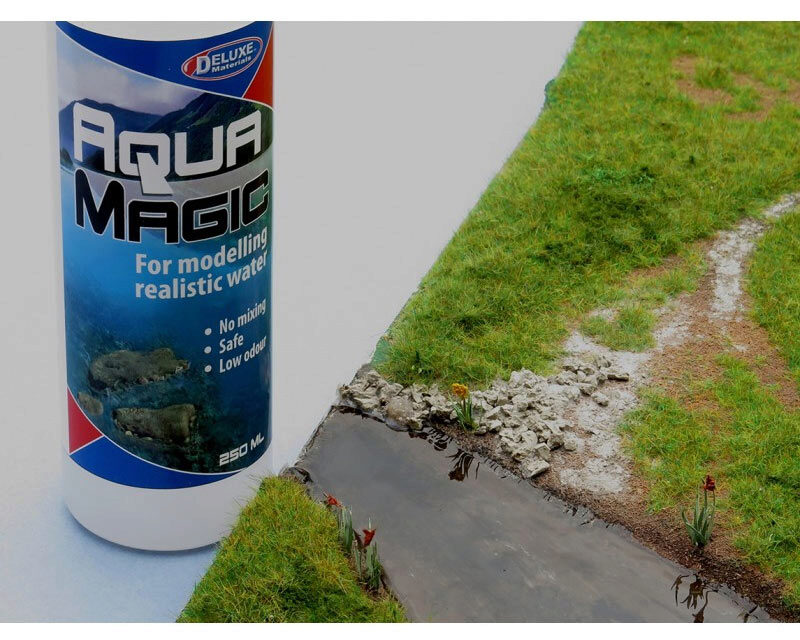 Aqua Magic ist eine Einkomponenten-Lösung zur Modellierung von Wassereffekten wie Flüssen, Kanälen, Seen, Teichen, Pfützen und Schlamm. Anders wie beim Senic Water oder Solid Water von Deluxe Materials ist kein Mischen von harz und Härter notwendig. Es ist leicht zu gießen und trocknet schnell klar in 36-48 Stunden zu einem beeindruckenden lichtstabilen, hochreflektierenden Glanz. Aqua Magic kann mit wasserbasierten Farben und Lacken gefärbt und beim Trocknen strukturiert werden. Erhöhen Sie die Tiefe, indem Sie bei Bedarf Schichten hinzufügen.