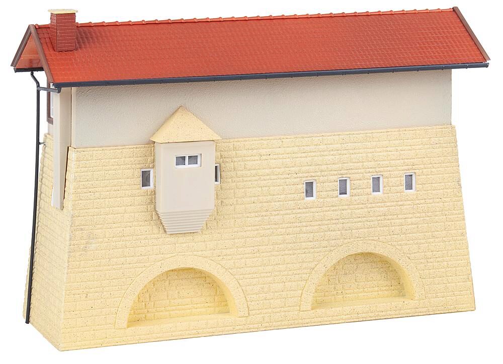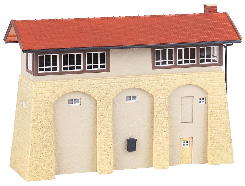 Schmales Stellwerksgebäude mit drei senkrecht gemauerten Rundbogenportalen und einem Satteldach. Der Bedienraum mit Fenstern befindet sich im oberen Stockwerk.