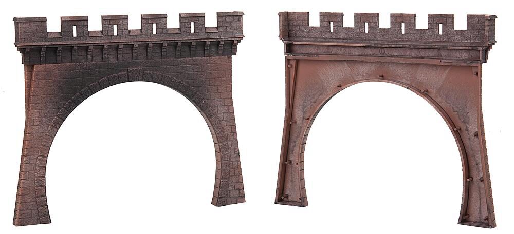 Zwei Kreisbogenportale mit Naturstein-Mauerwerk, Gesims und einer Brüstungsmauer mit Zinnen. Die Tunnelportale sind für Dampf- und Oberleitungsbetrieb verwendbar und 2-gleisig befahrbar.