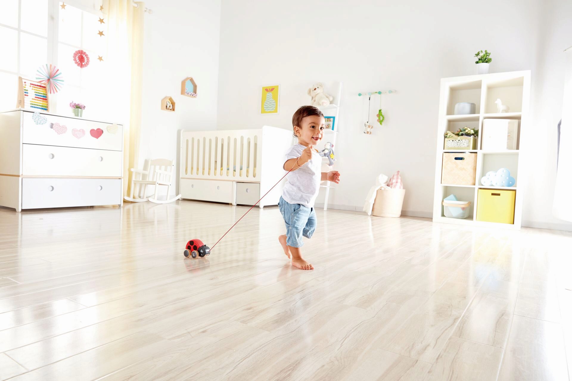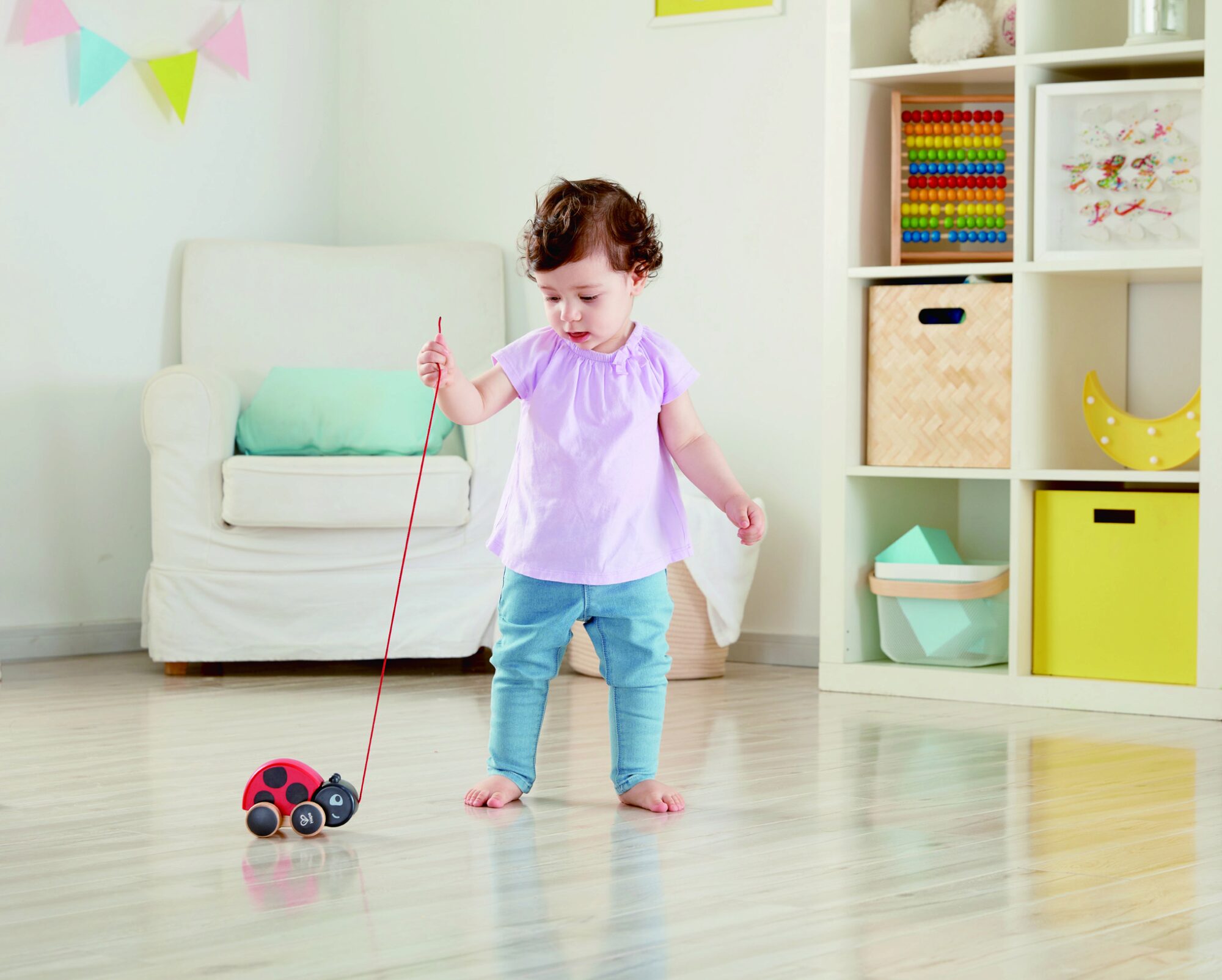 Marie flattert vor Freude mit ihre Flügeln, wenn man sie zieht. Sie ist perfekt geeignet, um Kinder zum Krabbeln, Laufen und Entdecken anzuregen.
