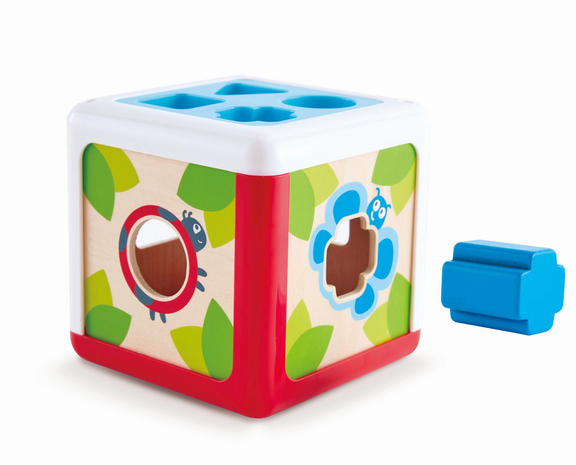 In der Sortierbox Gartenhütte finden die unterschiedlichsten Formen Platz: Kreuz, Kreis, Quadrat und Dreieck. Dabei entspricht jede Form einem Wesen aus dem Garten: Motte, Spinne, Schmetterling und Schnecke.