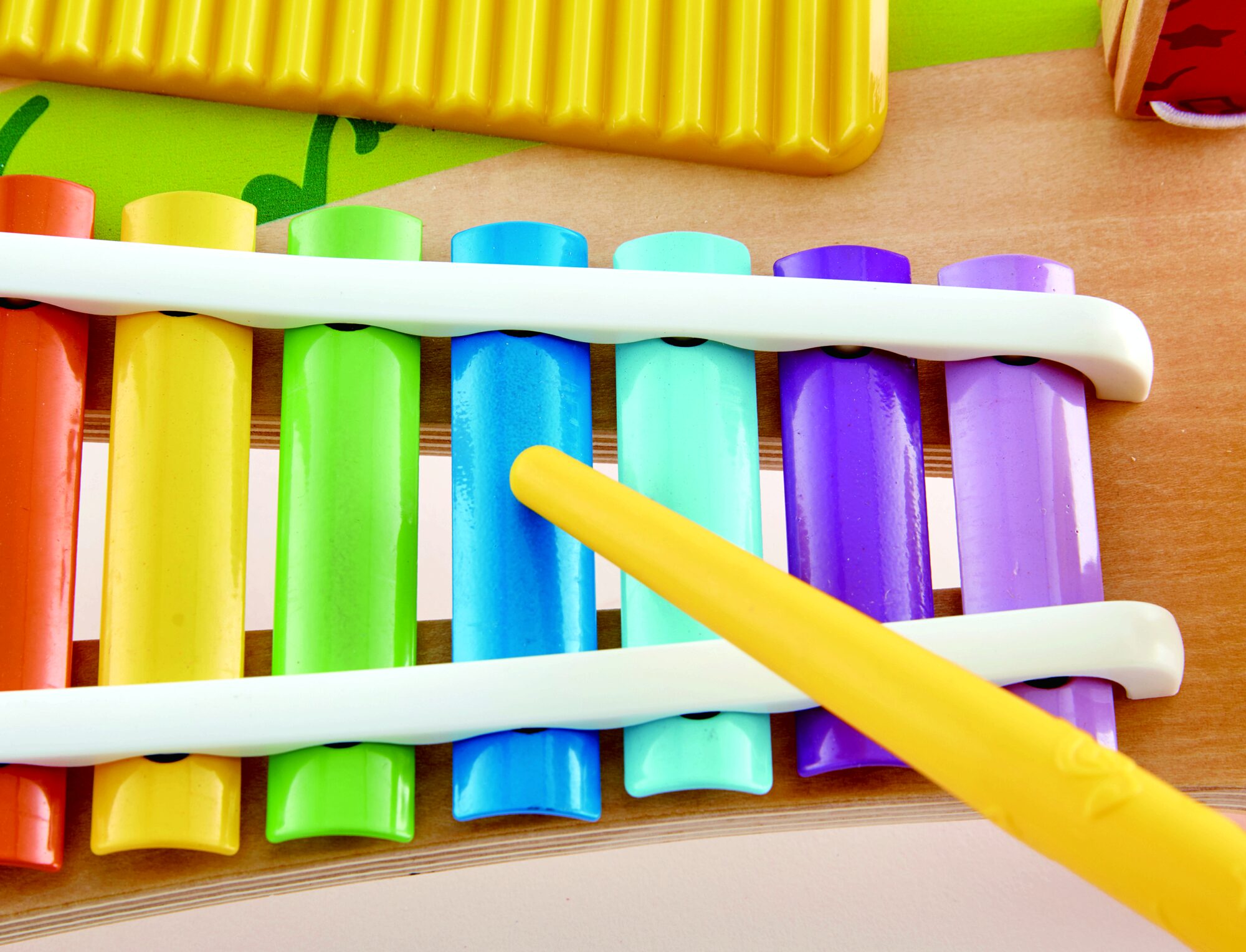 Mit der multifunktionalen Miniband bist du voll ausgestattet: Trommel, Xylofon, Becken, Scratchboard, Klöppel und zwei Schlägel machen dich zum perfekten Musiker.