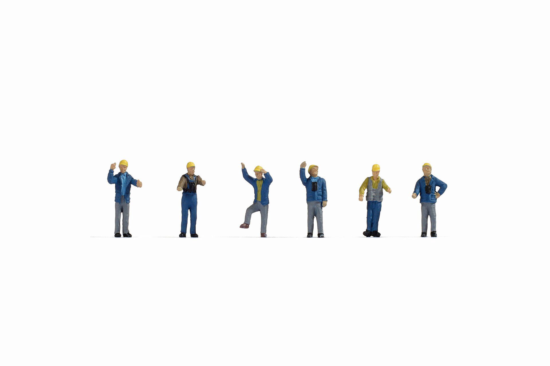 Das Set enthält sechs handbemalte Rangierer für die Spur H0 (Maßstab 1:87, ca. 2 cm hoch).