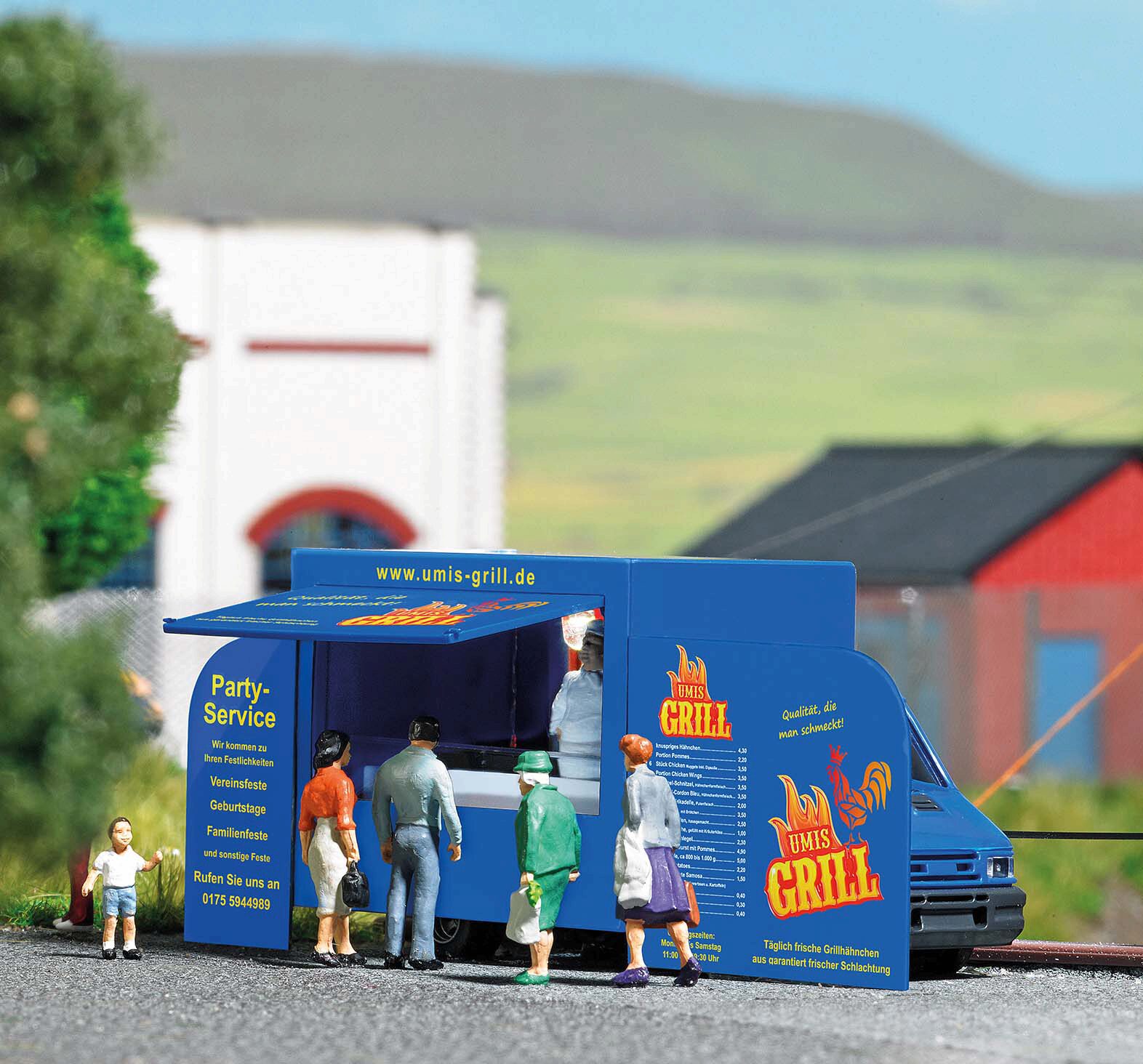 Iveco Daily Verkaufswagen für gegrillte Leckereien wie: Brathähnchen, Chicken Wings, Geflügelschnitzel usw. Mit Inneneinrichtung, Verkaufstheke, Innenbeleuchtung (weiße LED) und Grill mit Grillglut (rote LED). Komplett-Set einschließlich Stehtischen, Papptellern, Getränkedosen, Standschirm sowie Preis- und Werbetafeln. Zum Anschluss an 14 - 16 V Gleich- oder Wechselspannung.