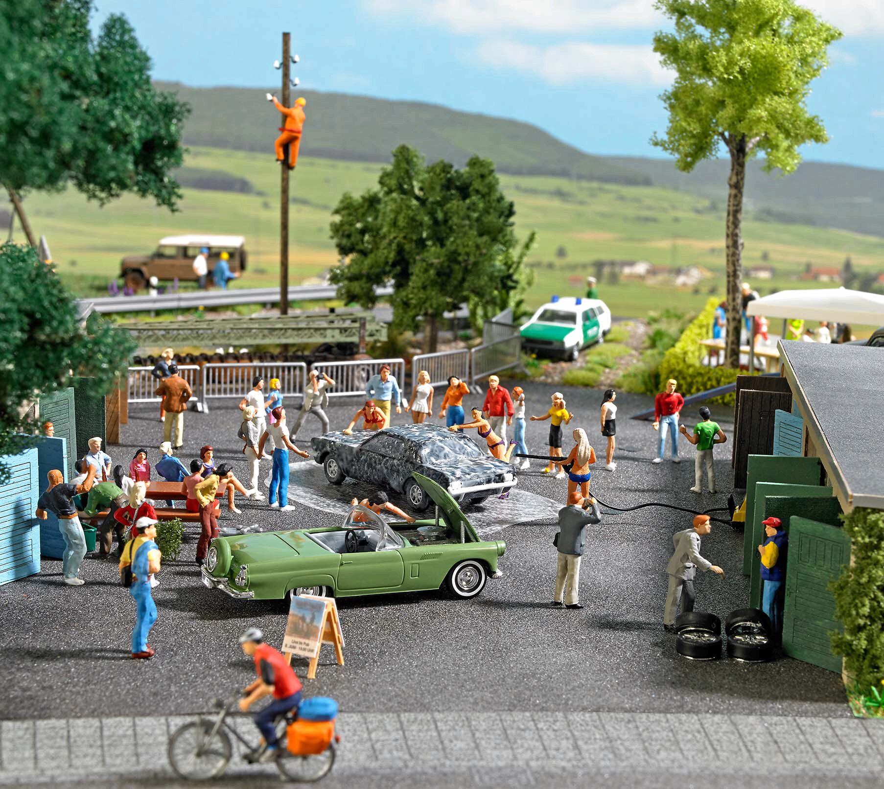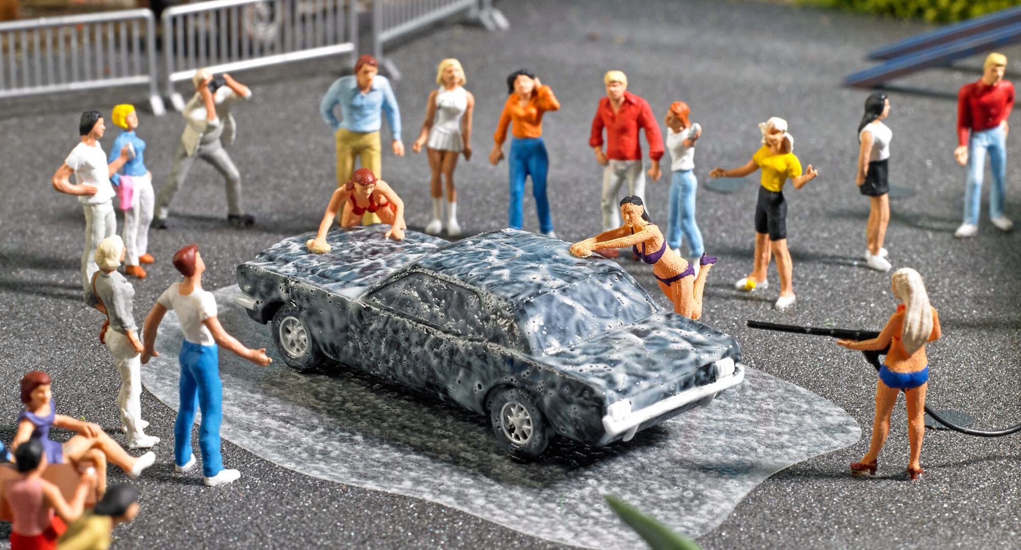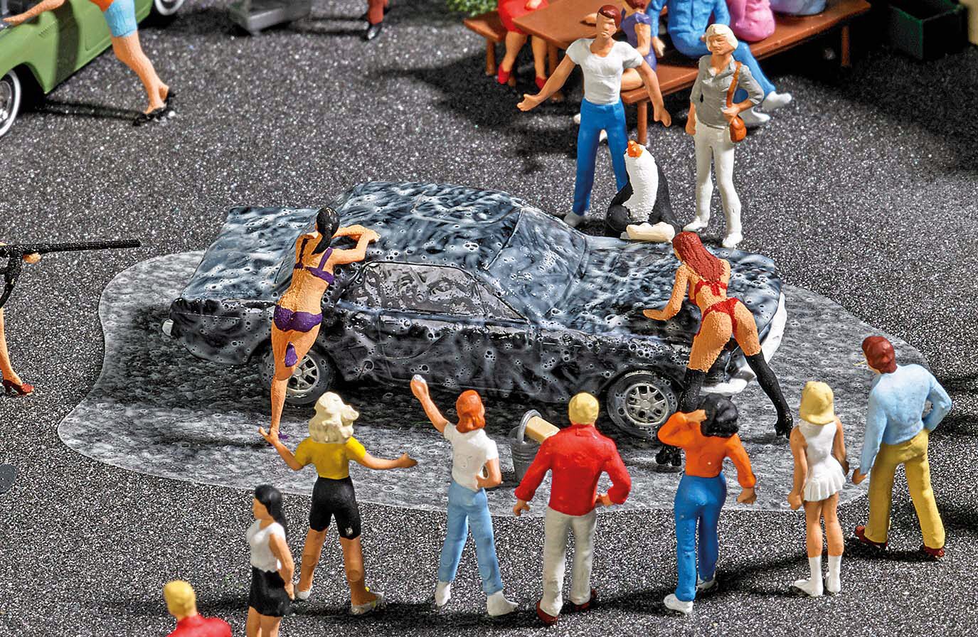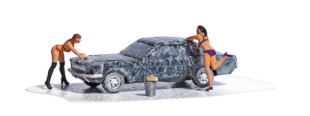Action Set für die realistische Belebung Ihrer Modellwelt. »Heiße« Autowaschszene mit 2 Bikini-Ladies, Eimer, Schwamm und reichlich eingeschäumtem Ford-Mustang auf einer Schaumlache.