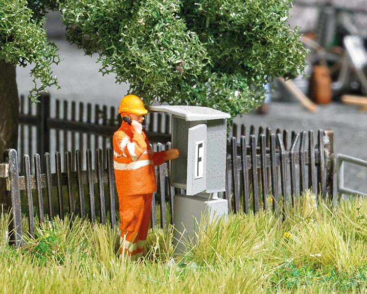 Action Set für die realistische Belebung Ihrer Modellwelt. Signalfernsprecher mit Geländer und Bahnbedienstetem der DB AG.
