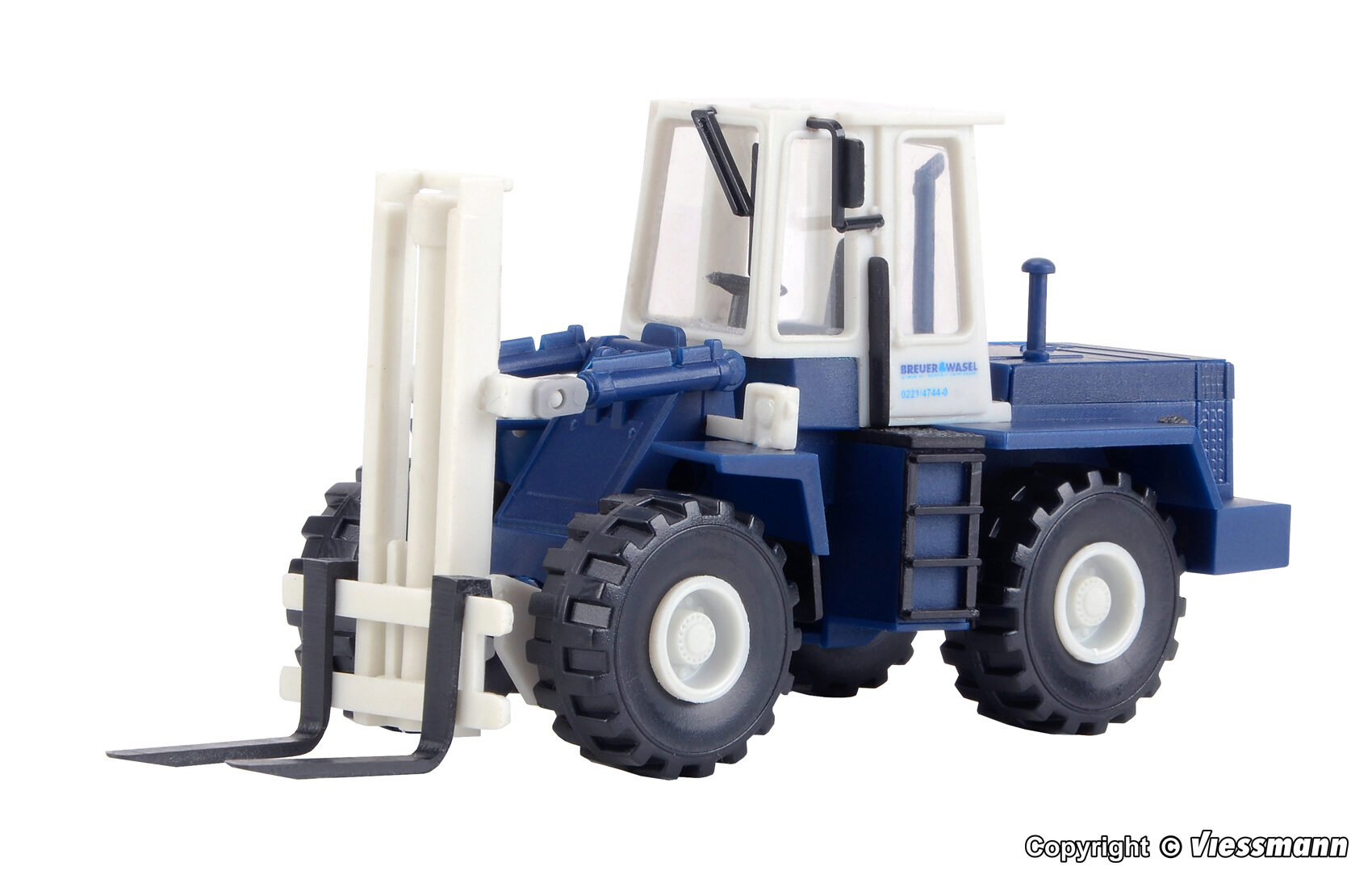 Bausatz. Vorbilddaten: Ursprünglich für den Einsatz beim ehemaligen Bundesgrenzschutz bestimmt, gelangte das sogenannte Feldumschlaggerät auf Basis eines O&K-Radladers in den Fuhrpark der Firma BREUER KRANE bzw. des Nachfolgeunternehmens BREUER & WASEL. Dort wurde der geländegängige Stapler zur Unterstützung bei Montage und Betrieb der Raupenkräne genutzt. Das Modell ist mit hochwertiger Tampon-Bedruckung versehen. L 7,7 x B 2,7 x H 3,6 cm. Schwierigkeitsgrad: 2 (Fortgeschrittene).