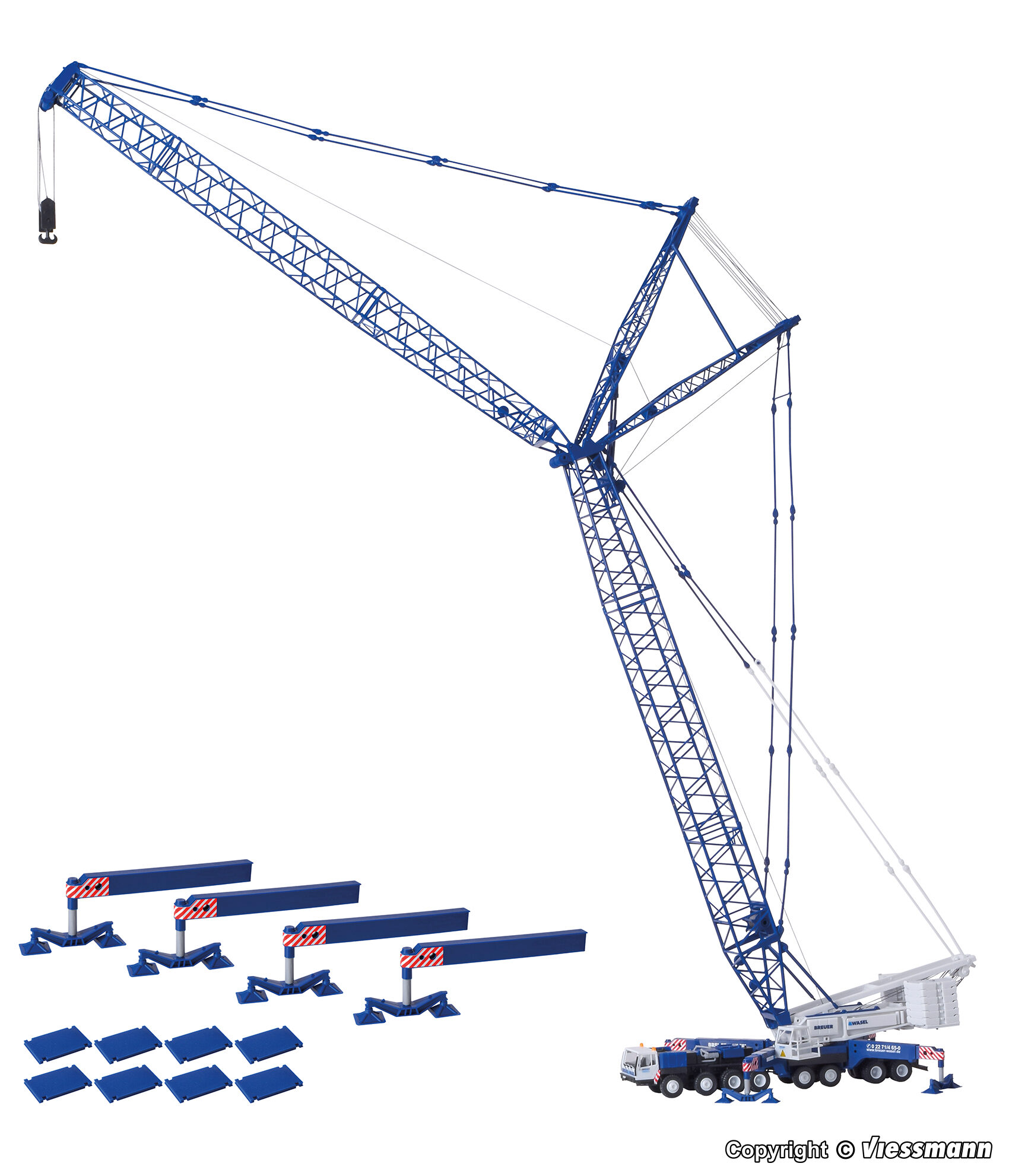 Bausatz. Zur BREUER & WASEL-Reihe gehört dieser mobile Gittermastkran LG 1550. Dem Vorbild entsprechend, verfügt das Modell über einen schweren Haupt- und Wippausleger. Haupteinsatzgebiete sind die Montage von Windkraft- und Industrieanlagen. Das Modell ist mit hochwertiger Tampon-Bedruckung versehen. Dazu passt der Begleittransporter Art. 13057. Maße: L 25,2 x B 8 – 22 x H 72 cm. Schwierigkeitsgrad: 3 (Profis).