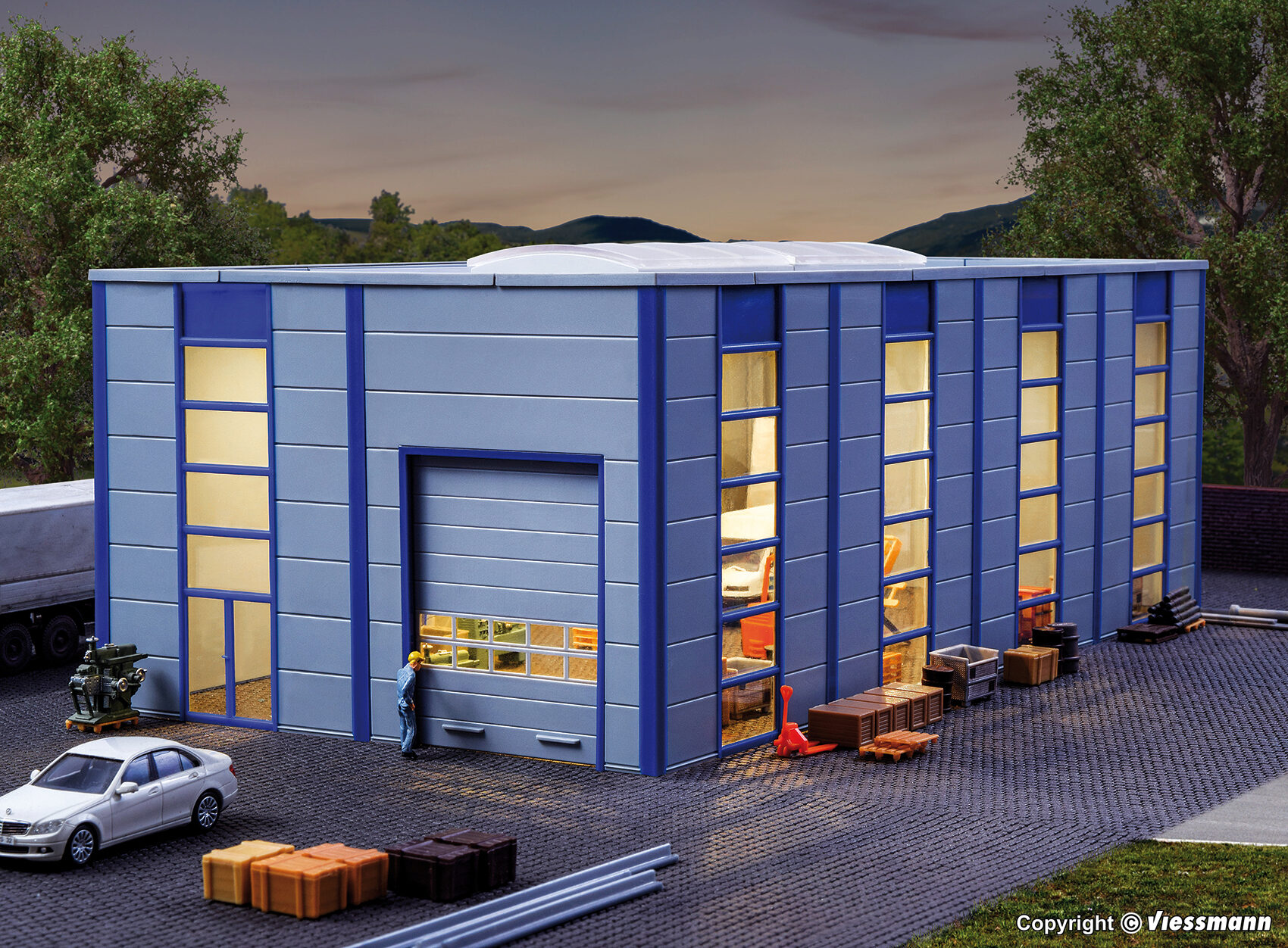 Bausatz. Diese Lagerhalle der Epochen V – VI kann durch die Modulbauweise individuell nach Platzangebot aufgebaut werden, indem man sie z. B. um ein Feld kürzt (je Feld ca. 7 cm). Die Halle kann mit einem zweiten Bausatz verlängert werden (in Schritten von 7 cm). Das Tor ist manuell beweglich. L 28 x B 14,2 x H 10 cm. Schwierigkeitsgrad: 2 (Fortgeschrittene).