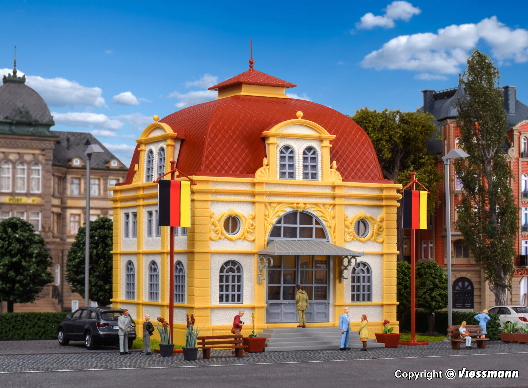 Dieses imposante Gebäude dient als Botschaftssitz. Dem Bausatz liegt die praktische und variable Etageninnenbeleuchtung von Viessmann bei. Diese bietet unbegrenzte Möglichkeiten zur individuellen Beleuchtung von Gebäuden mit großen Fensterfronten. L 12,6 x B 12,5 x H 16,7 cm.