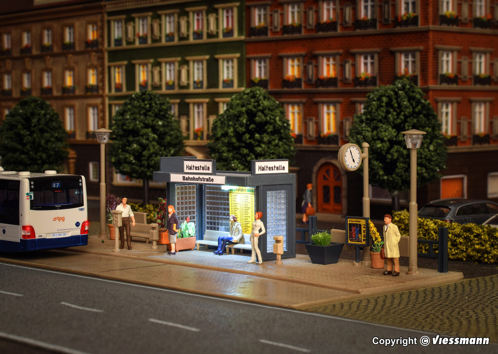Kommt der Bus pünktlich oder hat er wieder Verspätung? Solche kleinen Haltestellen findet man häufig entlang innerstädtischer Buslinien. Eine LED unter dem Dach leuchtet den Wartebereich gleichmäßig aus, die beiden Straßenlampen sind ohne Funktion. L 19 x B 8 x H 5 cm.