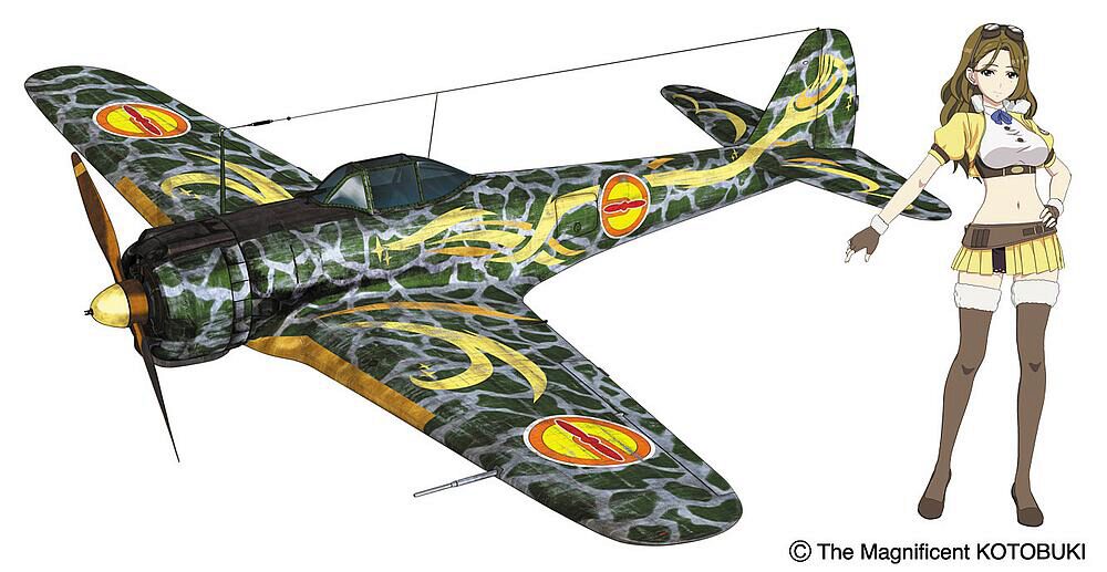 Plastikmodellbausatz eines japanischen WWII-Kampfflugzeugs, hier in den Decals der japanischen Animee-Serie The Magnificant Kotobuki, 73 Teile, inklusive Figur. Länge gebaut 184 mm / Breite 238 mm.
