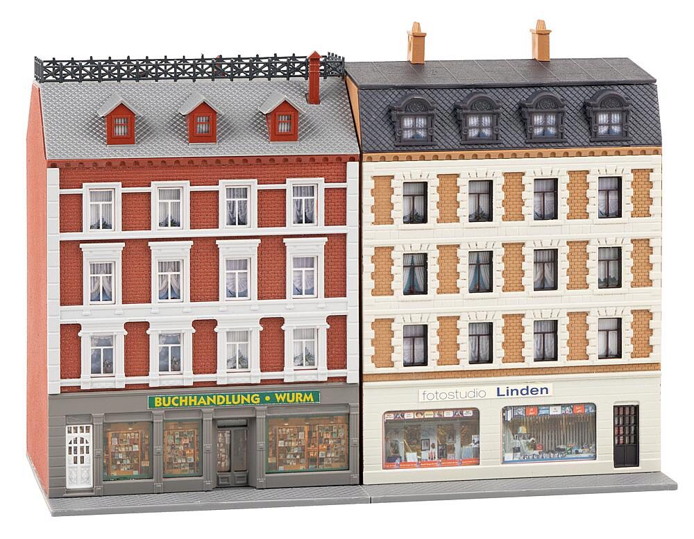 Stadtszenen! Zwei viergeschossige Mietswohnhäuser mit Klinkerfassaden, gründerzeitlichem Stuckdekor und Ladengeschäften im Erdgeschoss. Die beiden Modelle sind einzeln baubar und lassen sich in einer Häuserzeile variabel anordnen.