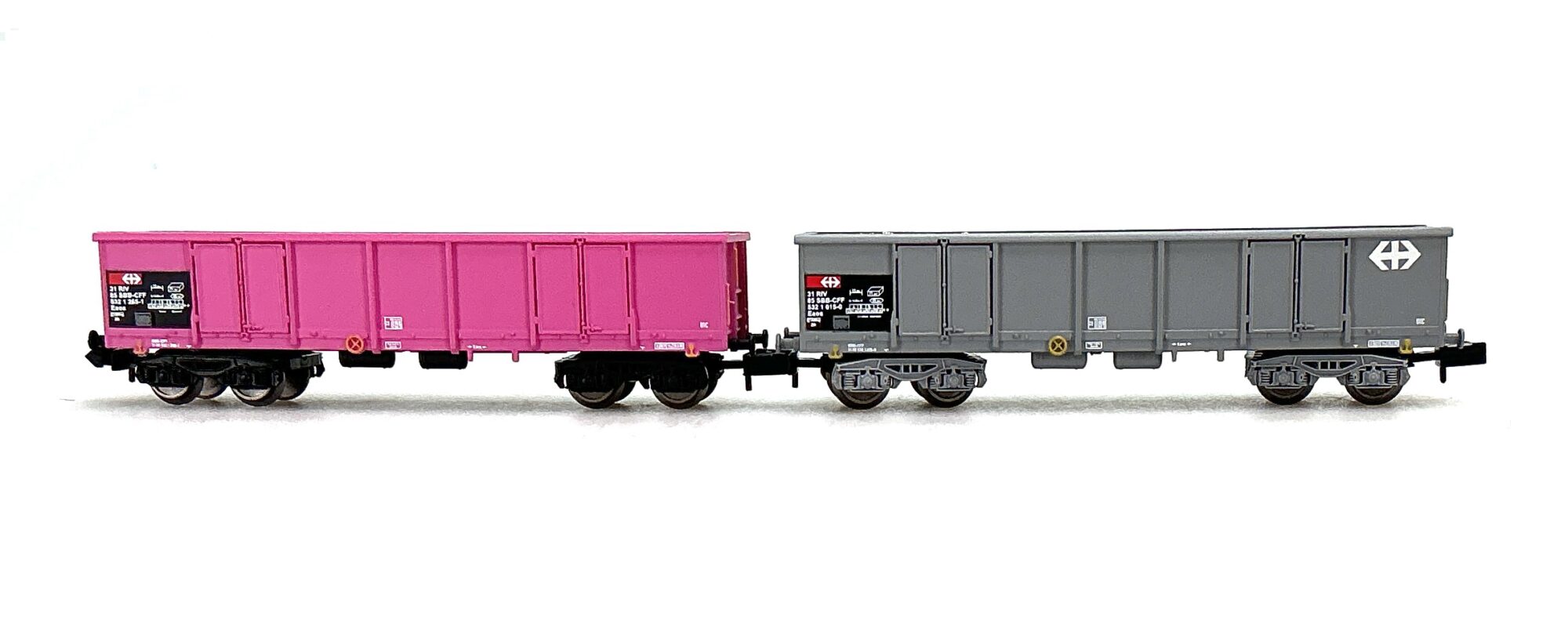 SBB 2 Hochbordwagen Eoas grau und pink mit Schrott beladen