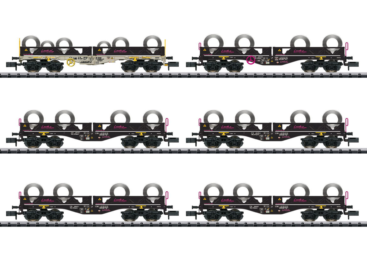 Vorbild: 5 vierachsige Containertragwagen der Bauart Sgmmnss 40' der Laude und 1 vierachsiger Containertragwagen der Bauart Sgmmns 190 der AAE. Beladen mit Coils. Betriebszustand 2017