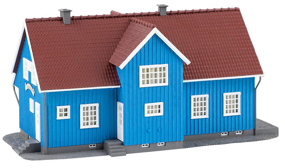 Traditionelles, einstöckiges Schwedenhaus, mit senkrechten Holzpaneelen im auffälligen Blauanstrich verschalt und mit dazu farblich abgesetzten, weißen Sprossenfenstern. Ein dritter Giebel und eine Dachgaube mit Schriftzug zieren die Langseiten des kleinen Ladengeschäfts mit regionalen Köstlichkeiten. Eine Bodenplatte mit Betonsockel ist im Bausatzumfang enthalten.