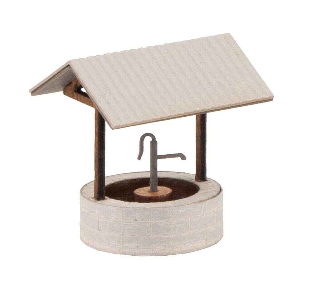 Garten- oder Dorfplatzmittelpunkt! Lasercut-Modell eines gemauerten Zierbrunnens mit Überdachung und Wasserpumpe. Modell ohne Funktion.