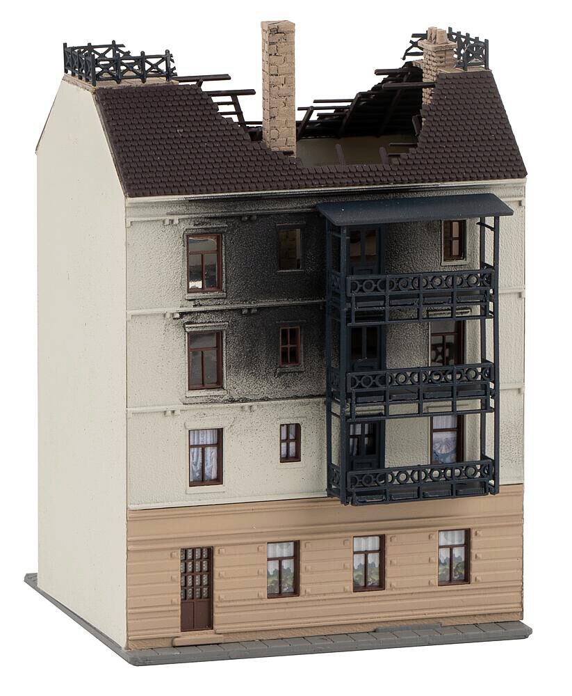Vierstöckiges Altstadt-Mietshaus mit rauchgeschwärzter Stuckfassade und teilausgebranntem Dachstuhl.