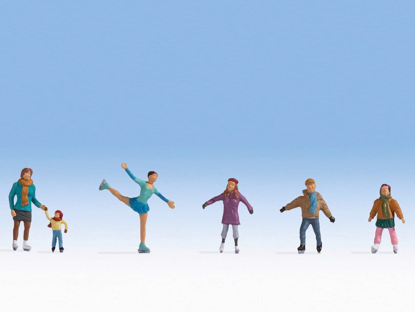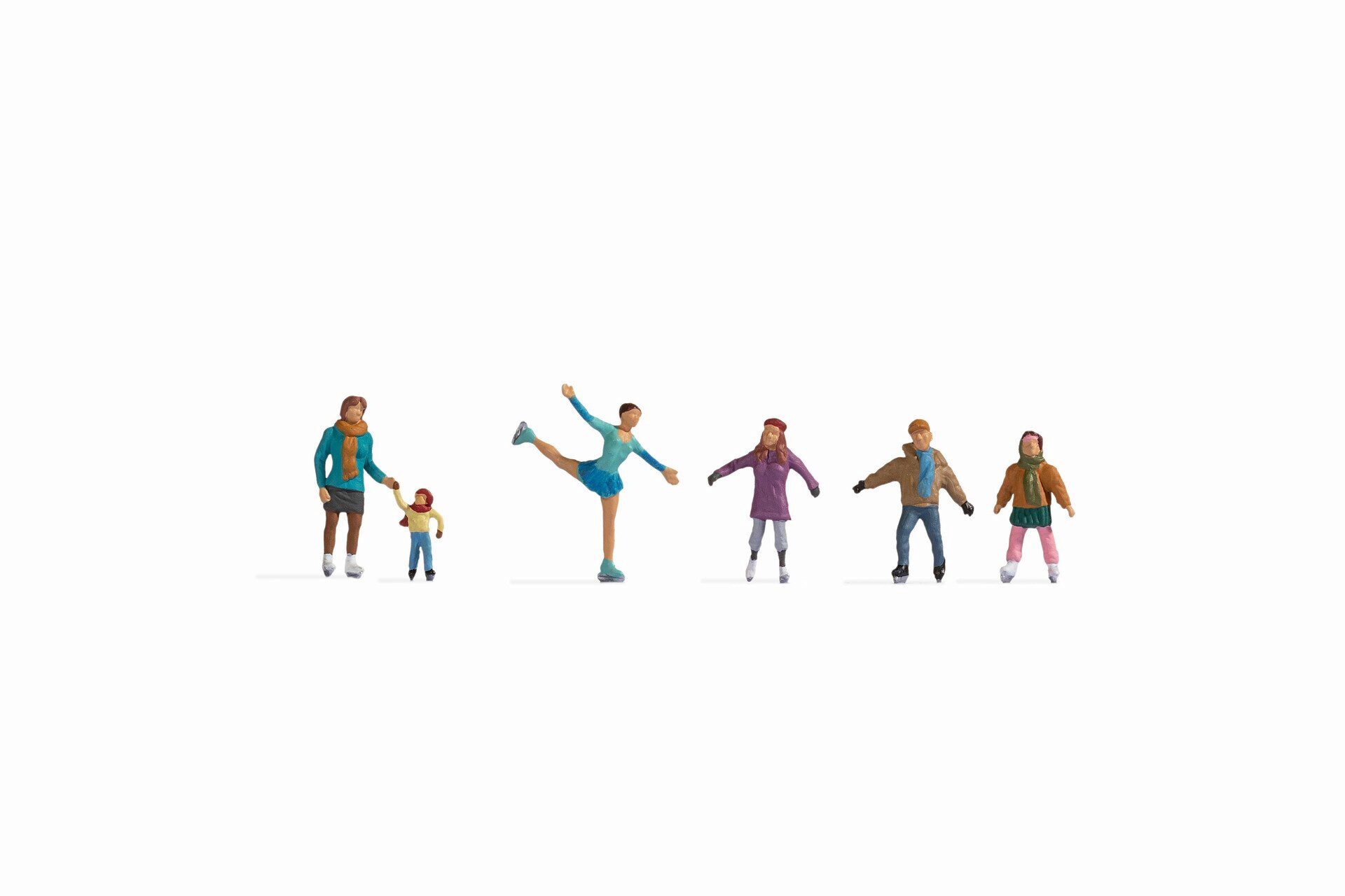 Das Set für die Spur H0 (Maßstab 1:87, ca. 2 cm hoch) enthält sechs Figuren beim Schlittschuhlaufen.