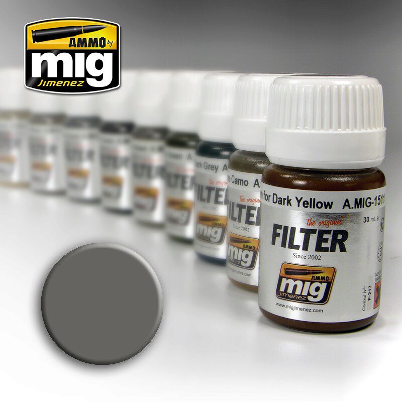 In 2002 Mig Jimenez created for first time the FILTERS, based in his technique developed in 1998. These products become very popular around the world and now after many years we decided to release them again with a new look and re-formulated. The most genuine Mig's product now under AMMO label.Filter easy and ready to use directly on your model. This filter is specially designed for use on bright or white winter surfaces such as tanks, spaceships, light colored aircraft, or vehicles of the United Nations. Use the filters by moistening a brush and applying it without flooding the surface, to enrich hues in your models, unify camouflage, or highlight areas with a different tone. With these products we will avoid mixing paints, looking for the correct dilution, or searching for the correct colors for our vehicle. These filters are enamel based and can be cleaned or diluted with Odorless Enamel Thinner. 30 mL jar.