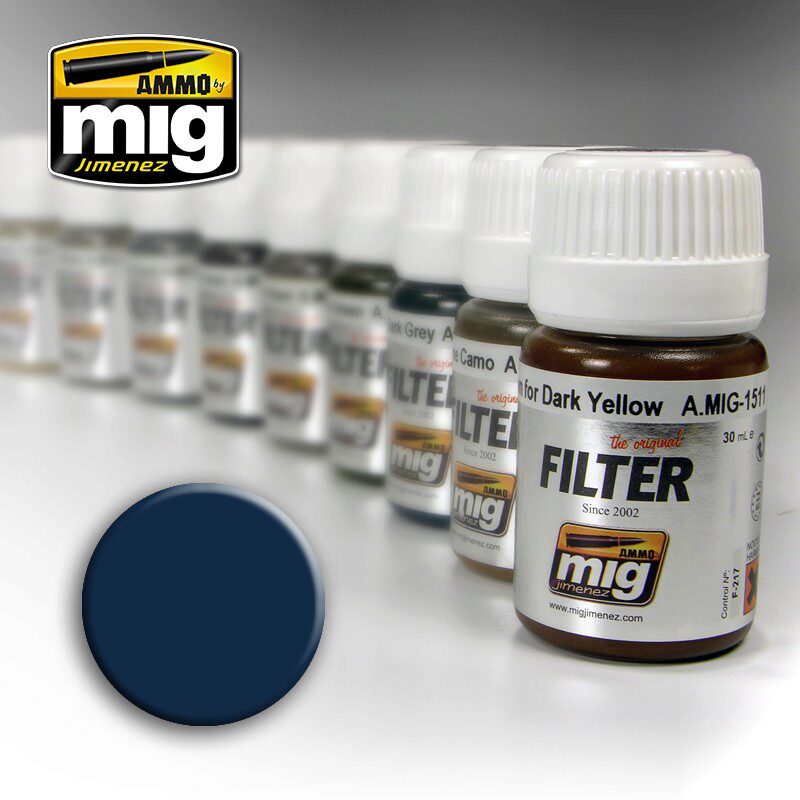 In 2002 Mig Jimenez created for first time the FILTERS, based in his technique developed in 1998. These products become very popular around the world and now after many years we decided to release them again with a new look and re-formulated. The most genuine Mig's product now under AMMO label.Filter easy and ready to use directly on your model. These filters are specially designed for use on any Panzer Grey German vehicle from WWII; but also on aircraft, robots or any other dark grey surface. Use the filters by moistening a brush and applying it without flooding the surface, to enrich hues in your models, unify camouflage, or highlight areas with a different tone. With these products we will avoid mixing paints, looking for the correct dilution, or searching for the correct colors for our vehicle. These filters are enamel based and can be cleaned or diluted with Odorless Enamel Thinner. 30 mL jar.