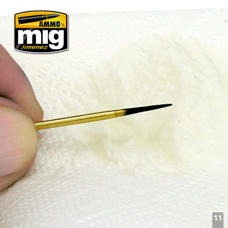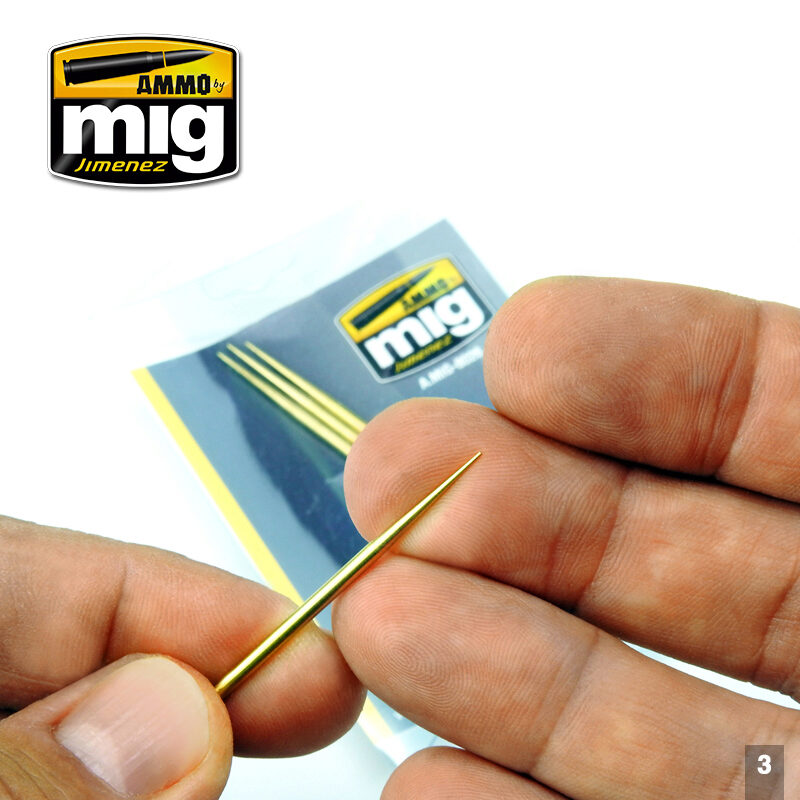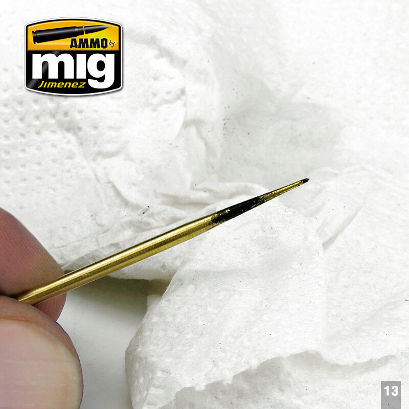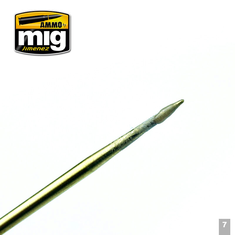 This new addition to our catalogue allows miniaturists to carry out a multitude of assembly and weathering tasks. It is a small tool similar in appearance to a wooden toothpick but made of high-quality machined brass. This versatile tool serves as a perfect cyanoacrylate applicator which can be easily cleaned after each use by simply burning the glue which disappears completely, leaving it ready for each new use. This tool also allows you to simulate small scratches and chips on painted surfaces, a must have when working with Scratches Effects (A.MIG-2010) and Heavy Chipping Effects (A.MIG-2011). Thanks to its rigidity, we can also use it as a punch to engrave panels, registers, or rivets. Some of the most useful modeling tools are simple, this is a must-have for both construction and painting.