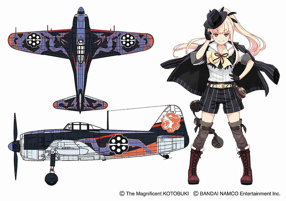 Plastikmodellbausatz eines japanischen WWII-Kampfflugzeugs, hier in den Decals der japanischen Anime-Serie: The Magnificant Kotobuki. Mit 88 Teilen, Markierung FIO. Länge gebaut: 185 mm. Breite: 250 mm.