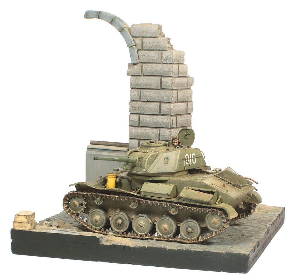 Dioramensockel aus Resin mit der Ecke eines beschädigten Hauses. 15,5 x 15,5 cm.