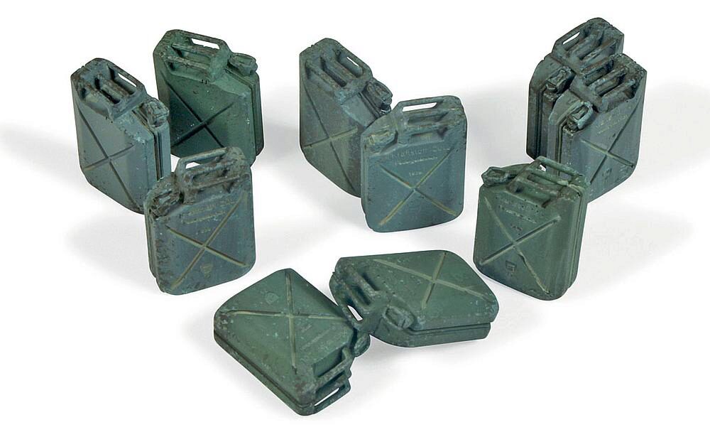 12 Benzinkanister für bis zu 20 Liter, wie sie von den Engländern und US-Amerikanern während des 2. Weltkrieges benutzt wurden. Nicht koloriert. Ideal für den Dioramenbau.