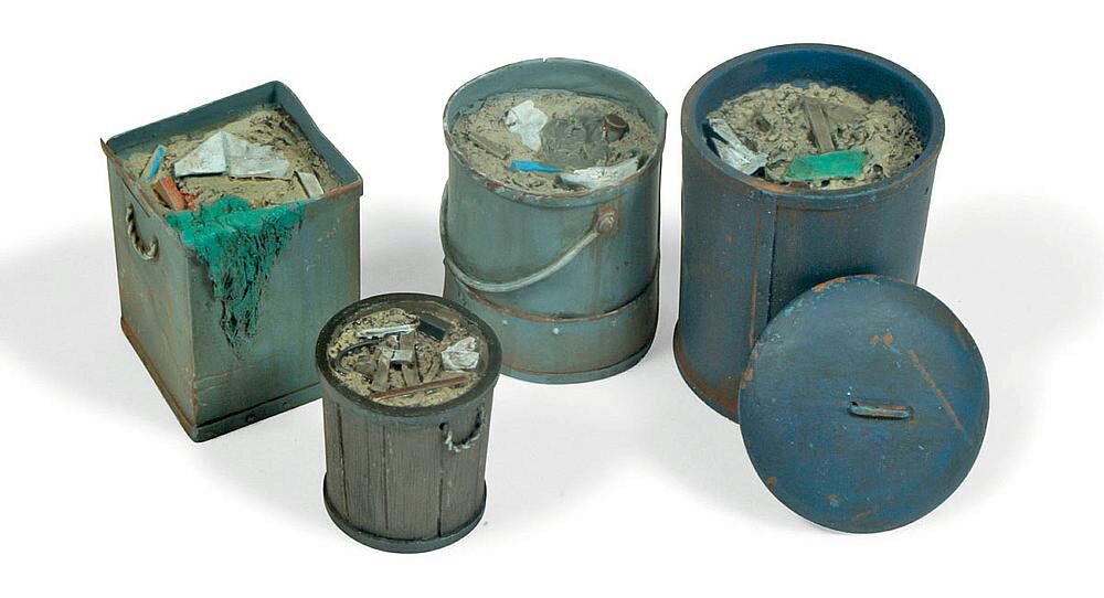4 verschiedene Metallmülltonnen. Nicht koloriert. Ideal für den Dioramenbau.