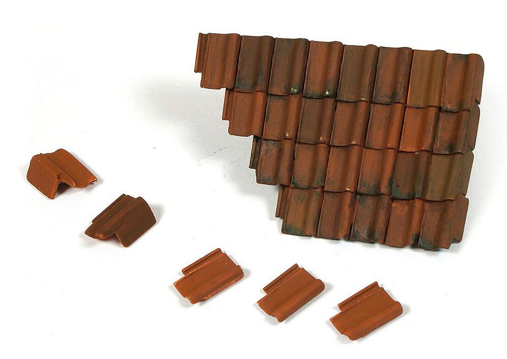 1 Teilstück eines beschädigten Daches mit zusätzlichen 12 Ziegeln im europäischen Stil. Nicht coloriert. Ideal für den Dioramenbau.