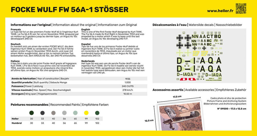 Es handelt sich um einen der ersten FOCKE WULF, die dem Ingenieur Kurt TANK zu verdanken sind. Der Fw 56 A führte seinen ersten Flug im November 1933 durch, und zwar mit einem Motor ausgerüstet, den er bis zu seinem letzten Typ beibehalten hat, dem ARGUS