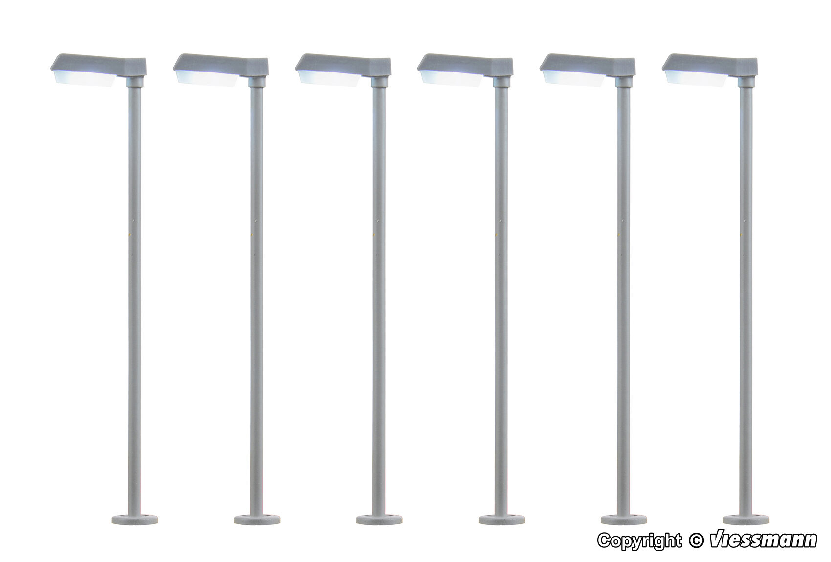Moderne Straßenleuchten der Epochen IV – VI. Wartungsfrei dank LED-Beleuchtung. Vorbildgetreuer Messingmast mit Patentsteckfuß für eine besonders einfache Montage. Günstiges Set mit 6 Leuchten Art. 6497 zum Preis von 5. Höhe: 5,5 cm.