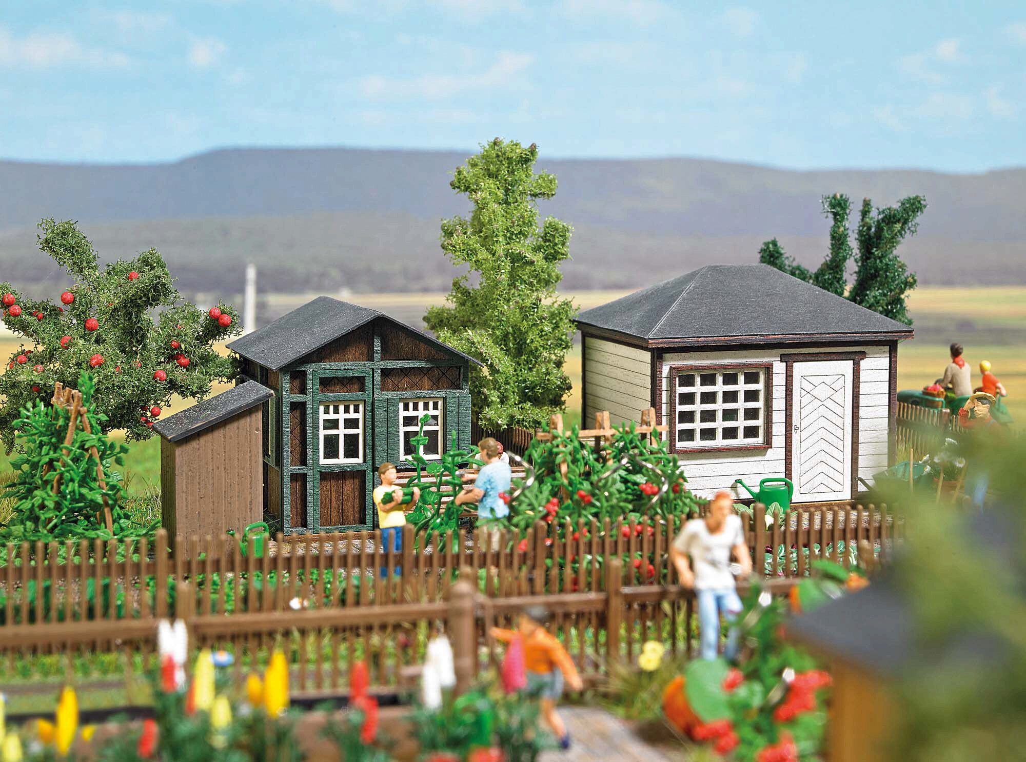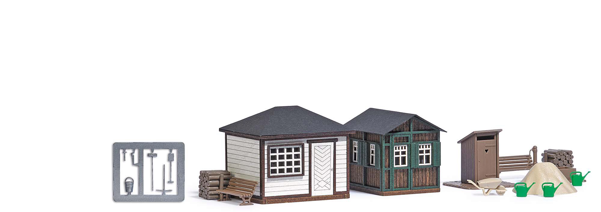 Bausatz für zwei Gartenlauben nach historischem Vorbild. In echter Holzbauweise aus bereits fertig kolorierten Teilen ausgeführt. Mit reichhaltigem Gartenzubehör: Zaun (650 mm lang), Sitzbänke, Holzstapel, Sandhaufen mit Schubkarren, Gartenbrunnen, Toilettenhäuschen, Werkzeug und Gießkannen.
