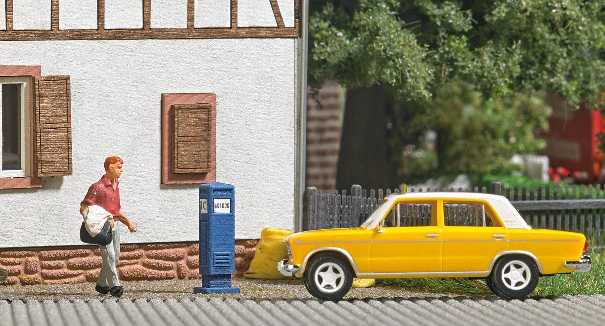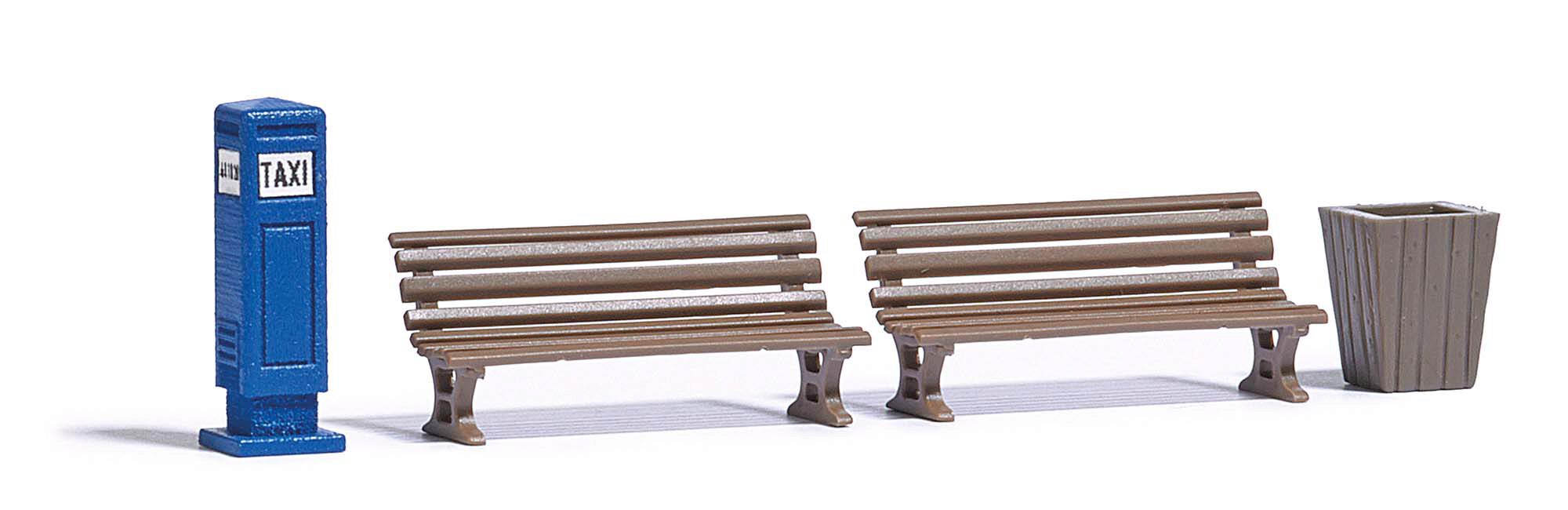 Taxisäule (Höhe 17 mm) nach ostdeutschem Vorbild. Mit Sitzbänken und Papierkorb.