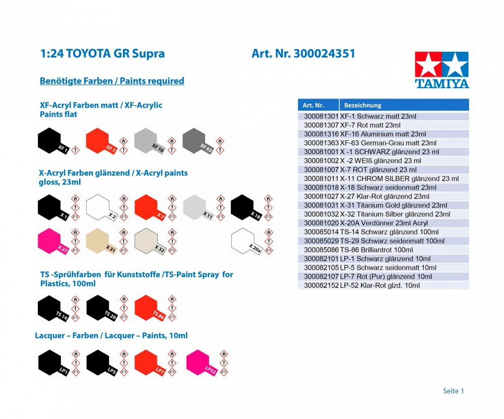 Das Standmodell ist eine Nachempfindung des Toyota GR Supra, welcher 2019 durch seine Ankündigung für weltweites Aufsehen sorgte. Mit seiner schönen Balance zwischen Leistung und dem ebenso elegant, aber sportlichem Aussehen, ergänzt der Toyota Supra die TAMIYA 1:24 Sportserie perfekt. Die detaillierte Verarbeitung spiegelt sich sowohl in den Details als auch in der enormen Passgenauigkeit der Teile wieder.