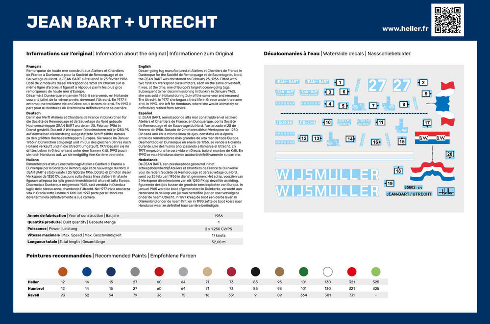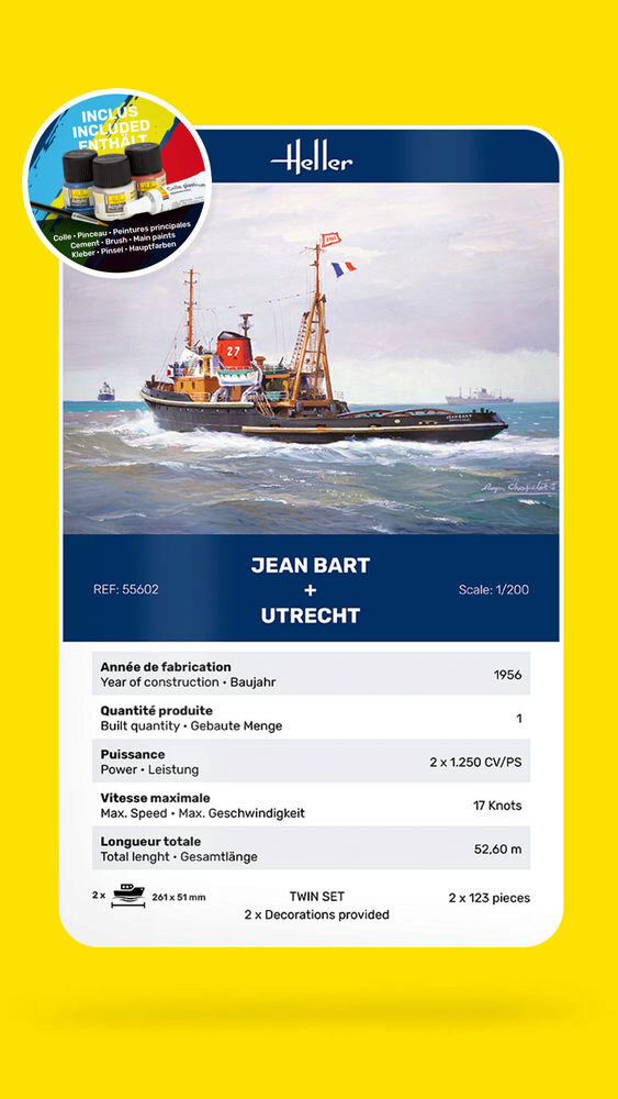 Der in der Werft Ateliers et Chantiers de France in Dünkirchen für die Société de Remorquage et de Sauvetage du Nord gebaute Hochseeschlepper JEAN BART wurde am 25. Februar 1956 in Dienst gestellt. Das mit 2 Werkspoor-Dieselmotoren mit je 1250 PS auf dems