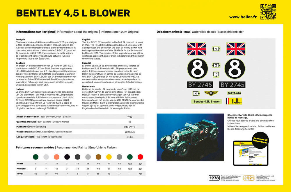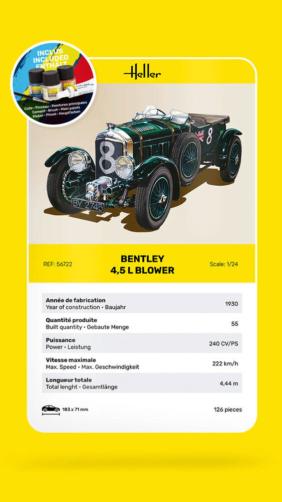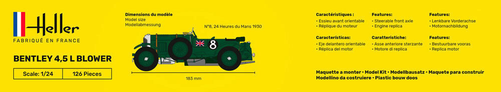 Im ersten 24 Stunden Rennen von Le Mans im Jahr 1923 steht der erste BENTLEY am Start. Das hier angebotene HELLER Modell ist einer der 4,5 Liter-Wagen mit Kompressor, den der Pilot Sir Henry BIRKIN trotz einer anders lautenden Meinung von W.O. BENTLEY, fu
