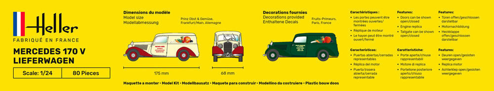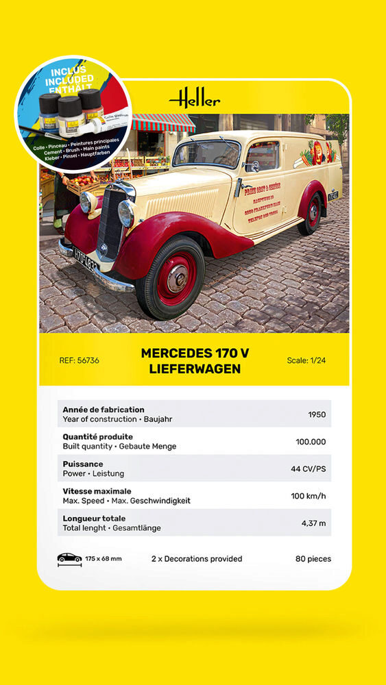 Features:• Motornachbildung• Heckklappeoffen/geschlossendarstellbarBeispiel Modell: P.GabrielDer 1935 auf den Markt gebrachte Mercedes 170 V war einbeachtlicher Erfolg. Mehr als 100.000 Fahrzeuge aller Art -Limousinen, Coupés und Nutzfahrzeuge - verließen
