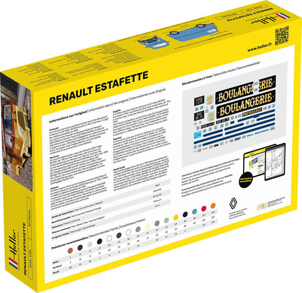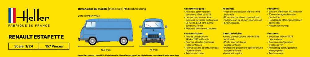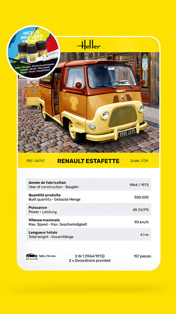 Heller Formneuheit(mit Pinsel, Farbe, Kleber)• 2 IN 1: Baujahr 1964 oder 1973 baubar• Türen offen/geschlossen darstellbar• Heckklappe offen/geschlossen darstellbar• MotornachbildungEs wird oft angenommen, dass der Renault 4 (Ref. Heller80759), der 1961 au