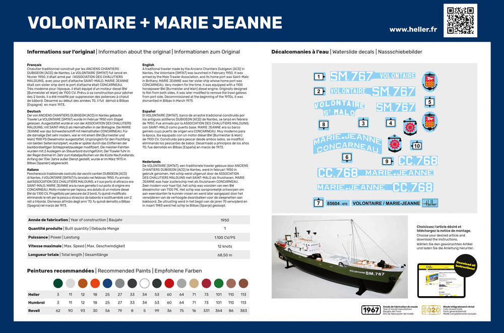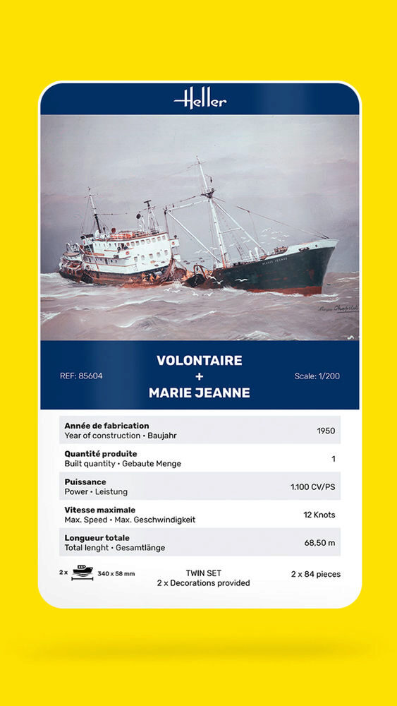 Der traditionelle Trawler der ANCIENS CHANTIERS DUBIGEON (ACD) aus Nantes, Le VOLONTAIRE (SM767) kam im Februar 1950 auf den Markt. Es wurde von der ASSOCIATION DES CHALUTIERS MALOUINS ausgerüstet und sein Heimathafen war SAINT-MALO. MARIE JEANNE war das